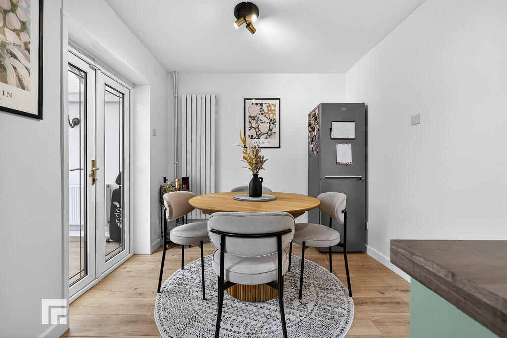 Diner: continuation of flooring, radiator, space for dining table and chairs, space or fridge/freezer door to conservatory.