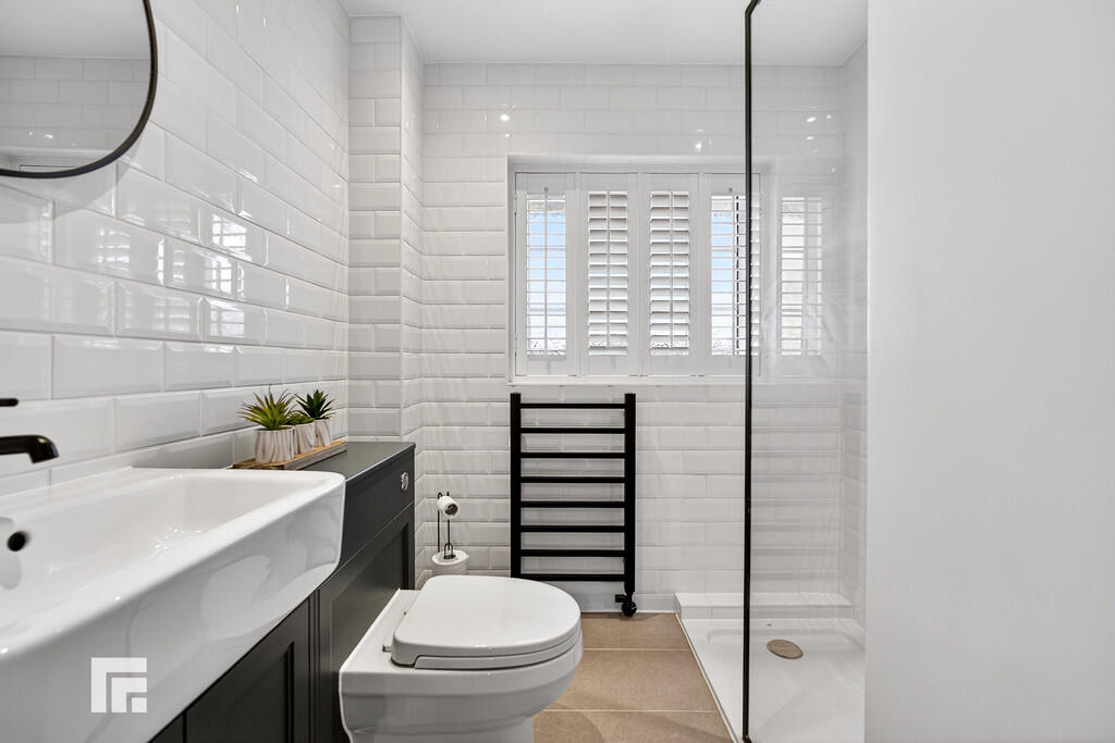 SHOWERROOM double glazed opaque window to the rear, with suite to comprise closed cistern wc, wash hand basin with vanity and glazed shower enclosure with electric shower, heated chrome towel rail, ceramic tile floor and walls.