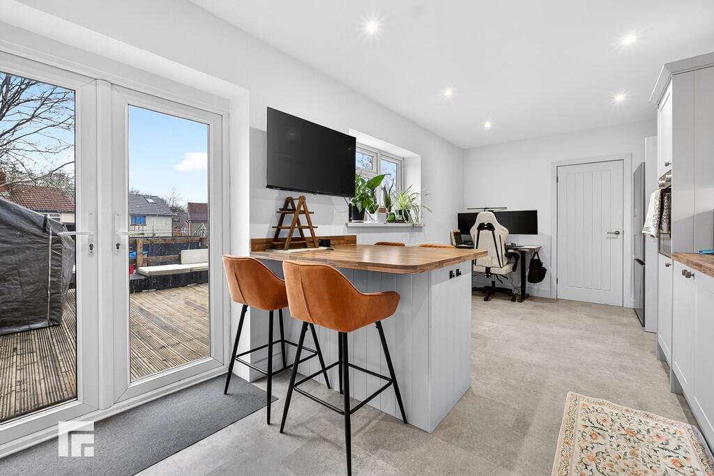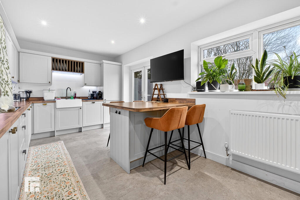 KITCHEN/DINER21' 3" x 9' 6" (6.48m x 2.91m) A beautifully presented modern Wren kitchen appointed along two sides with a range of base and eye level shaker style front units with brass handles below laminate worktops. Side island/breakfast bar with storage below laminate worktops. Room for four stools. Inset ceramic sink with brass mixer tap. Four ring induction hob with integrated extractor fan. Integrated dishwasher and electric oven. LVL flooring. Double glazed upvc window overlooking the rear garden. Double French doors leading to garden. Space for dining table. Space for American fridge freezer. Door to utility. Recessed spotlights. Radiator.