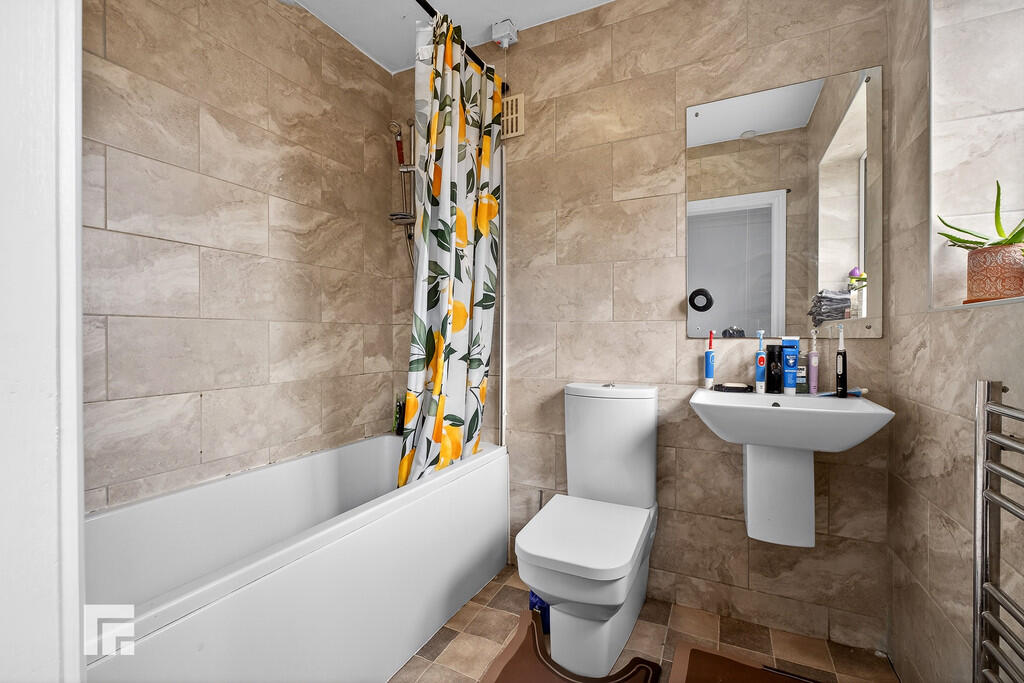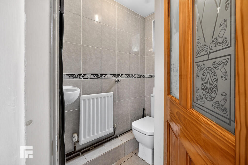 WC White suite comprising of low level wc, wash hand basin. Obscured glass window to front. Fully tiled walls and flooring. Radiator.