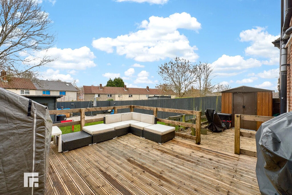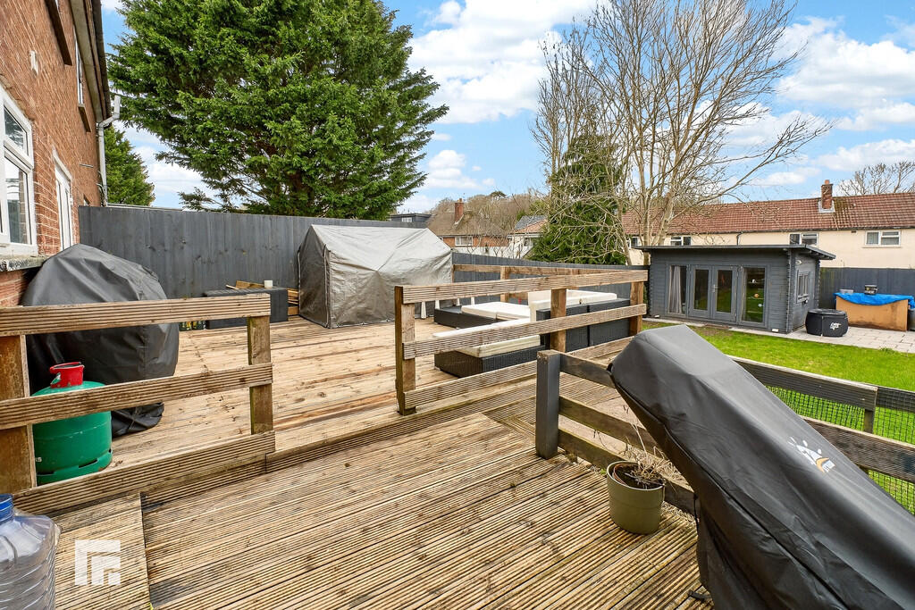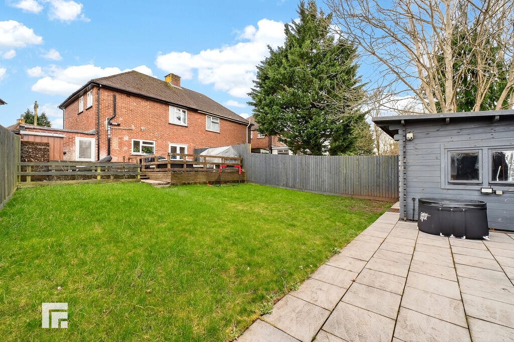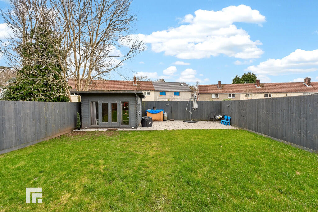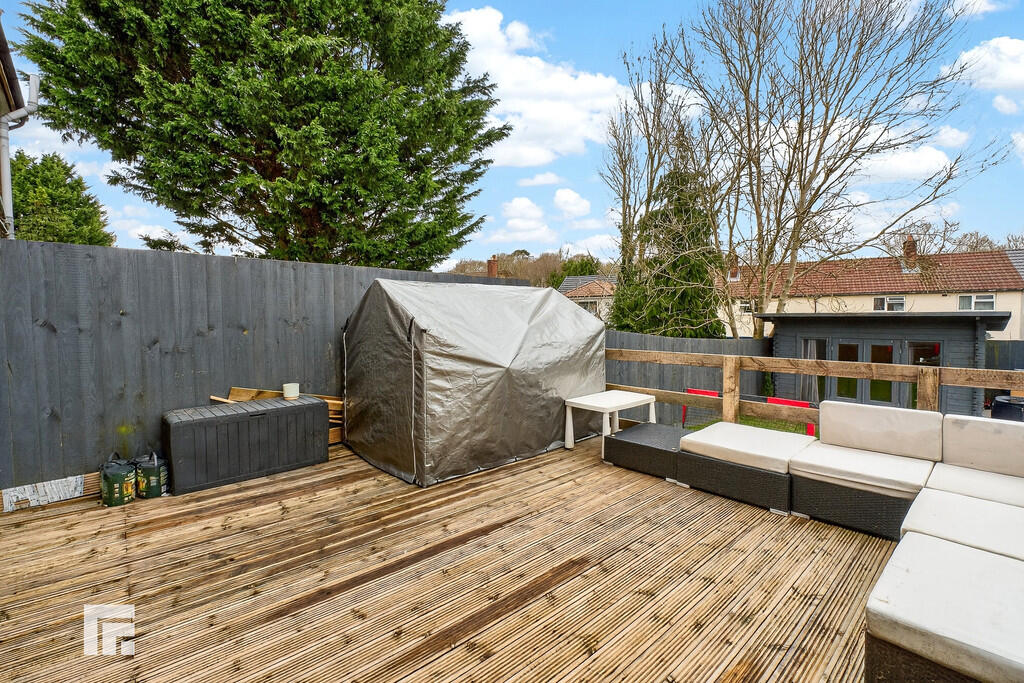 REARGARDEN An excellent sized rear garden enclosed by feather edged fencing. Approached via double French doors to decking with stairs down to a large area of lawn. An area of patio to the rear. Wooden shed with power. Outside lights are electric and plugged in. Outside power sockets. Outside tap.