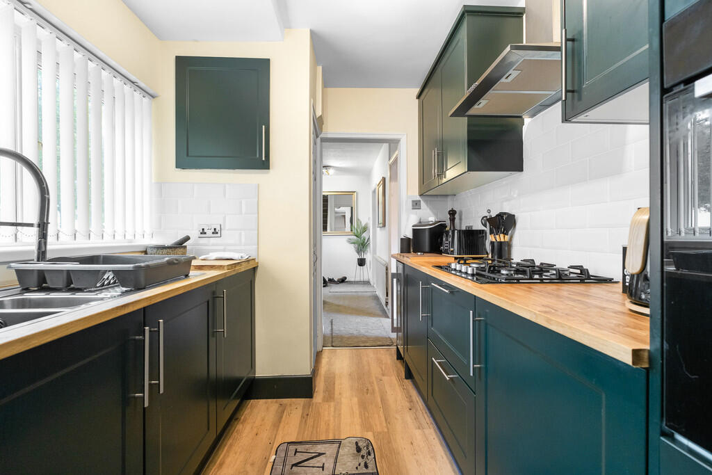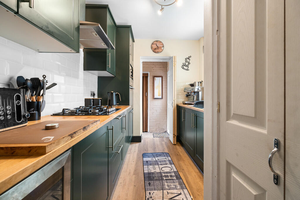 KITCHEN7' 3" x 7' 3" (2.22m x 2.21m) Double glazed uPVC window to front. A newly fitted kitchen with base and wall units with wooden work surfaces and tiled splash backs incorporating one and a half stainless steel sink unit with mixer tap. Built in oven, 4 ring gas hob and extractor hood over. Recess for wine chiller and microwave. Cupboard housing electric meter. Sliding door to:-
