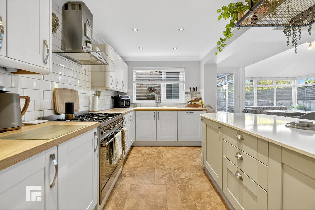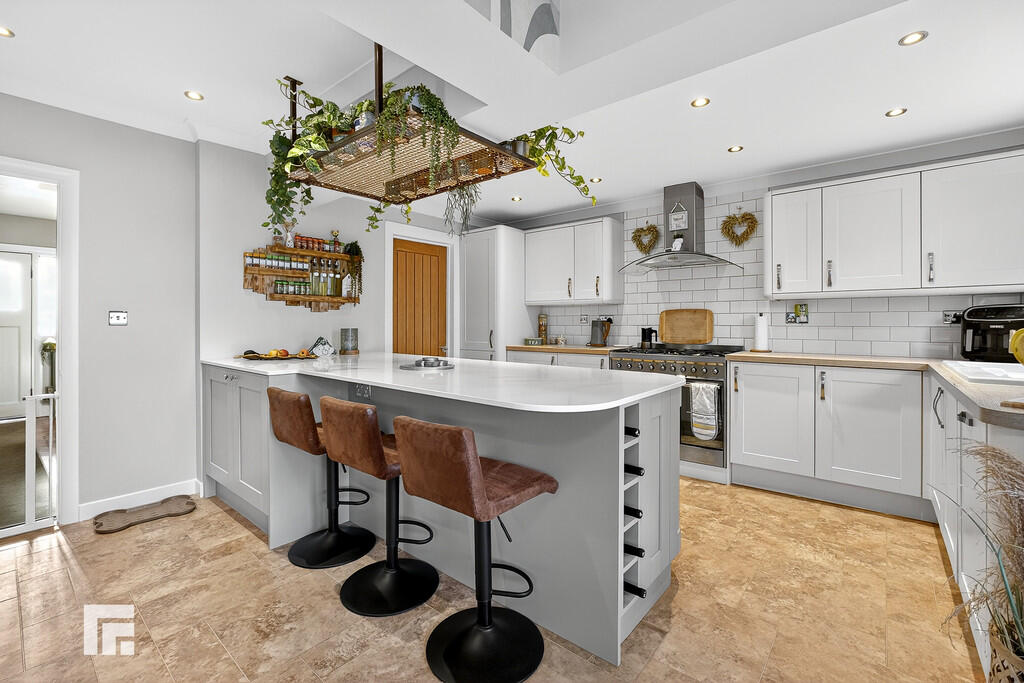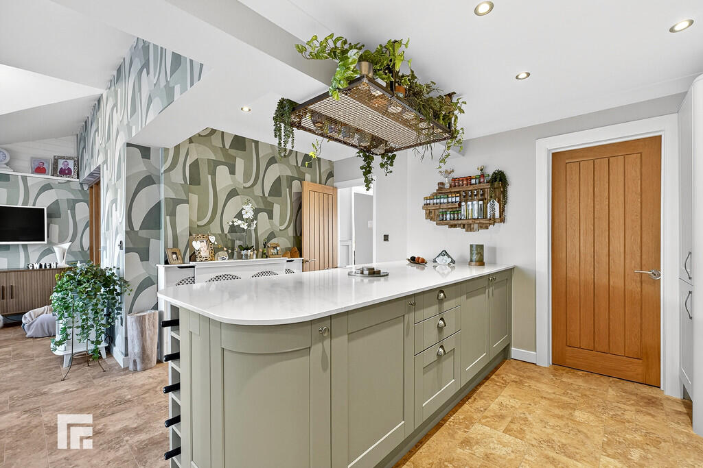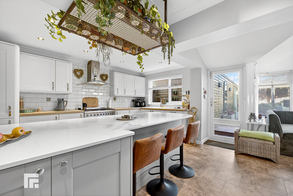KITCHEN/DINER15' 1" x 14' 7" (4.6m x 4.44m) Spacious open plan Kitchen/Diner with fitted kitchen to comprise a range of base and wall units with worksurfaces incorporating sink and drainer with mixer tap over. Six burner range hob and over to remain with extractor over. Integral dishwasher and wine fridge. Breakfast bar of similar finish to work surfaces. Double glazed window and door to the rear providing access to the garden. Antico style flooring. Door to Utility Room and open to Conservatory.