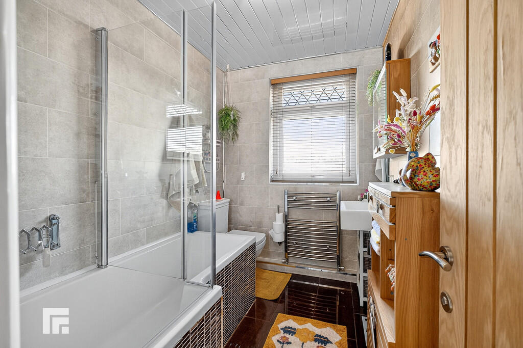 BATHROOM Double glazed window to the rear. With suite to comprise closed cistern w.c, wash hand basin and p shaped bath with shower over. Wall mounted heated chrome towel rail. Ceramic tile flooring and walls.
