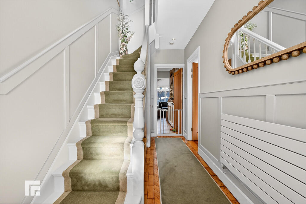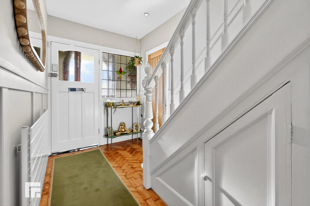 ENTRANCEHALLWAY Modern wall mounted radiator. Carpeted stairs to the first floor. Stained glass window to the front. Wall mounted modern radiator. Wood block flooring. Doors to ground floor rooms.