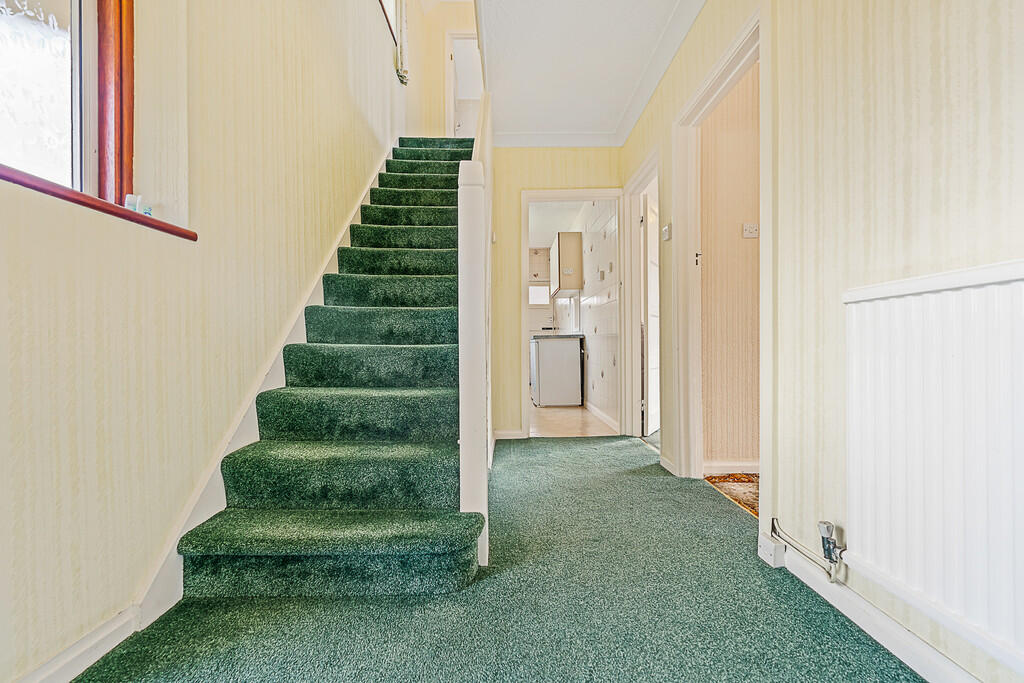 ENTRANCEHALL Entered via aluminium framed obscured double glazed door and window to front. Stairs to first floor. Radiator. Understairs storage cupboard housing meters. Thermostat.
