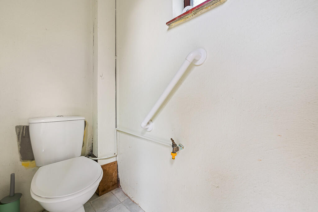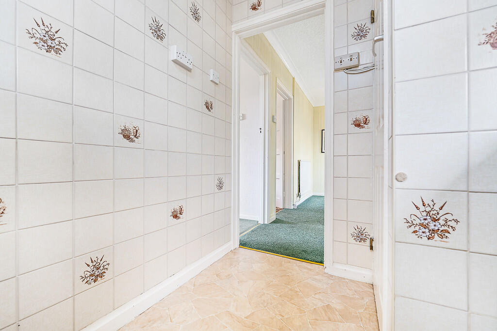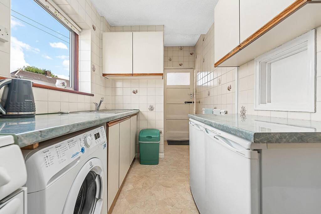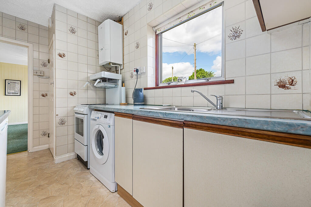 KITCHEN15' 7" Max into door recess x 6' 4" (4.75m x 1.95m) Aluminium framed double glazed window to front. Door to pantry with obscured aluminium framed double glazed window to front and shelving. Door to side leading to outside toilet and tool sheds. Serving hatch to lounge. Base and wall units with work surfaces and tiled splash backs incorporating stainless steel sink unit with mixer tap. Gas cooker point. Plumbing for washing machine. Space for fridge and freezer. Radiator. Textured ceiling. Modern wall mounted gas boiler.