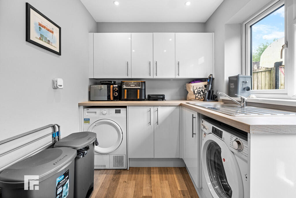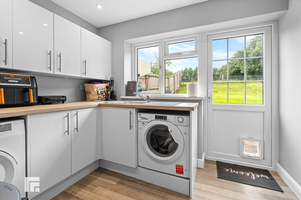 UTILITYROOM10' 7"(max) x 8' 10" (3.24m x 2.7m) Appointed along two sides, low and eye level cupboards beneath quality laminate worktops, stainless steel sink with chrome mixer tap and side drainer, space for washing machine, space for tumble dryer. uPVC window and door to rear. Door to cloakroom.