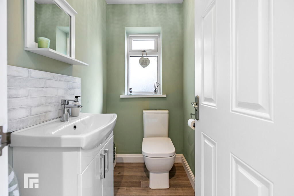 CLOAKROOM5' 3" x 3' 8" (1.62m x 1.12m) Modern white suite; low level WC, wash hand basin with chrome mixer tap and vanity. Continuation of laminate flooring. Tiled splashback. Chrome heated towel rail. Obscured glass window to side.