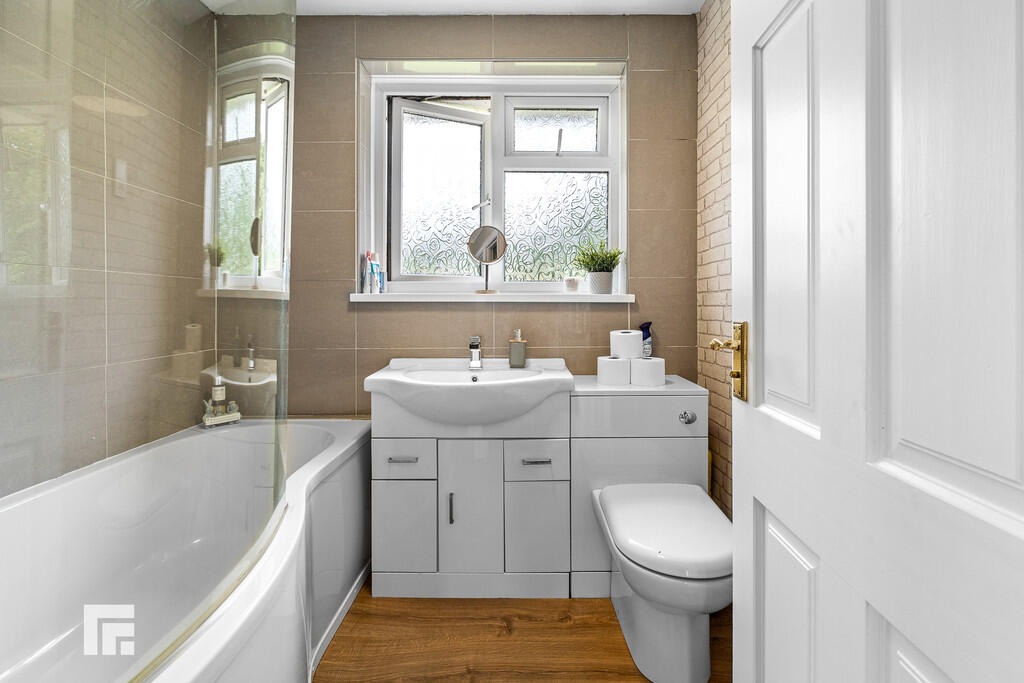 FAMILYBATHROOM6' 11" x 5' 7" (2.11m x 1.71m) Modern white suite, combined low level WC with wash hand basin, chrome mixer tap and vanity. Curbed bath either chrome mister tap and dual headed chrome shower. Extractor fan. Quality wood effect laminate flooring. Tiled splashbacks. Obscured glass window to rear.
