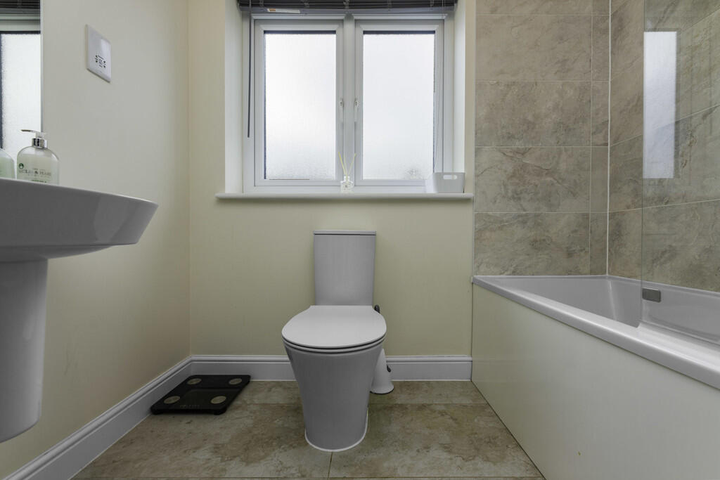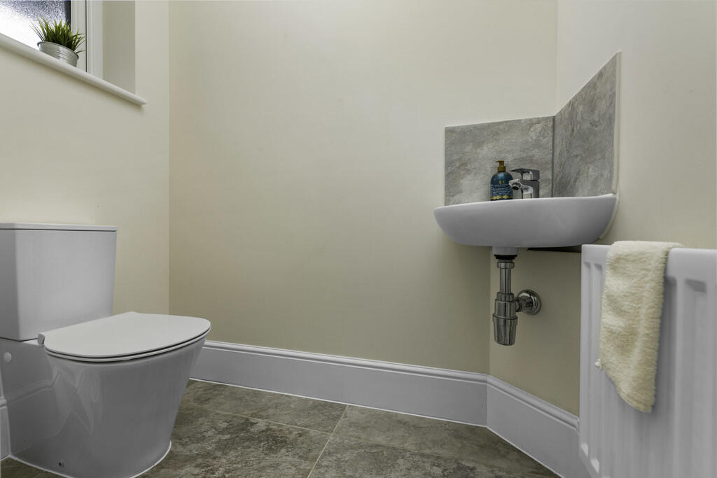 CLOAKROOM Quality white suite comprising low level W.C., wash hand basin, window to front and radiator.