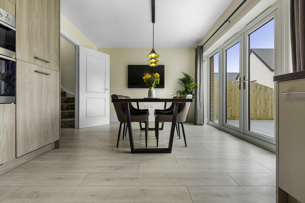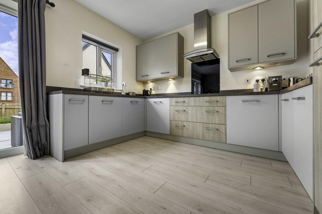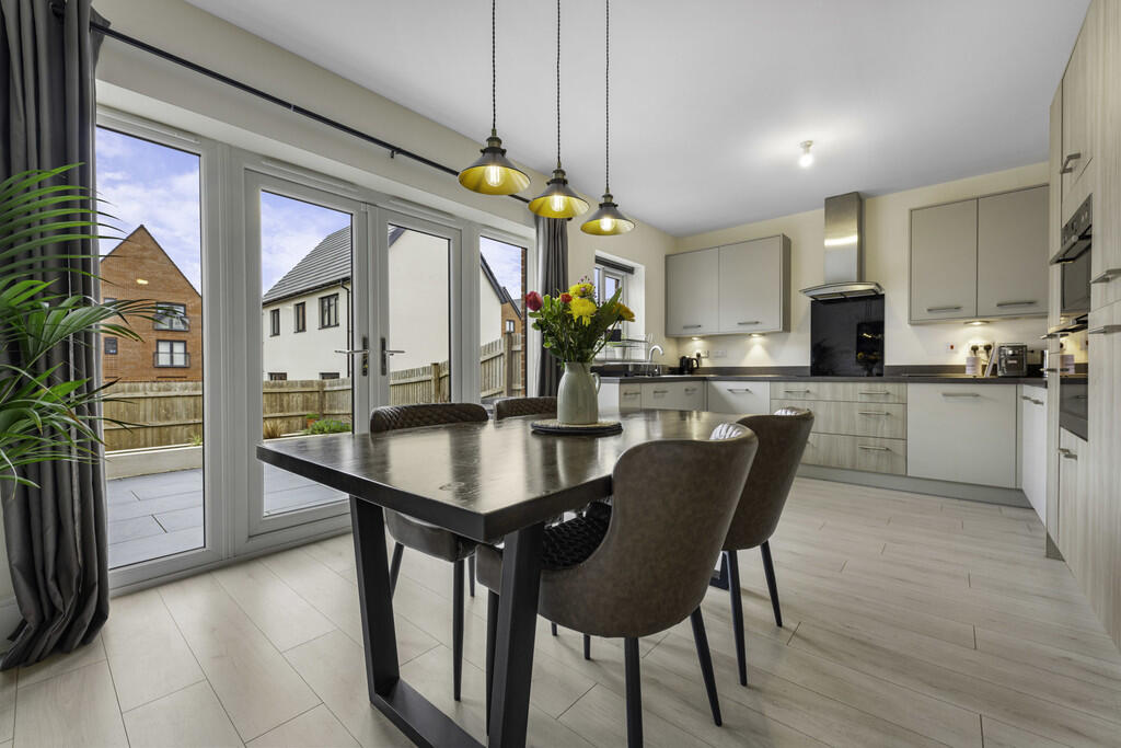 KITCHEN/DININGROOM17' 11" x 10' 11" (5.48m x 3.35m) Well appointed along three sides in light high gloss panelled fronts beneath square edge laminate worktop surfaces, inset 1.5 bowl stainless steel sink with side drainer, electric induction hob with chrome cooker hood above, chrome splashback behind hob, inset 'AEG' oven and grill, integrated fridge freezer, matching range of eye level wall cupboards, window to rear, double opening French doors with windows to either side leading to the rear garden, ample space for large family dining table, quality LVT flooring and radiator.