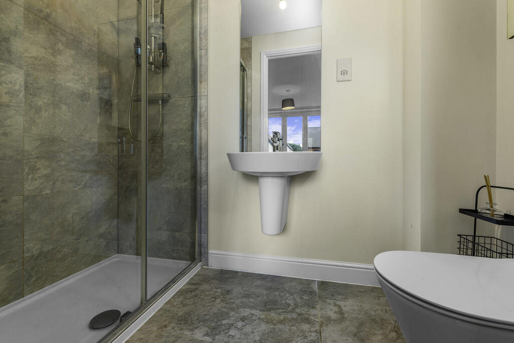 ENSUITESHOWERROOM Modern white suite comprising low level W.C, wash hand basin, double width shower cubicle with chrome shower, quality flooring, wall tiling to splashback areas, extractor fan, electric shaver point and chrome heated towel rail.