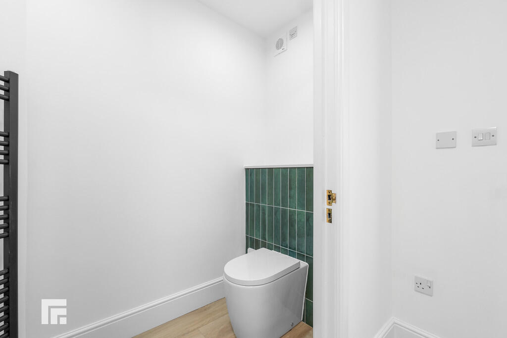 DOWNSTAIRSWC Continuation of laminate flooring. Partially tiled wall. WC. Matte black heated towel rail. Vanity wash hand basin with mixer tap over and storage beneath with tiled splashback. Pendant light. Extractor.