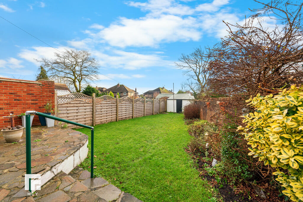Rear - South facing garden with lawn area. Patio sitting area. fence and brick wall to boundary. Garage access. Gate to side lane.
