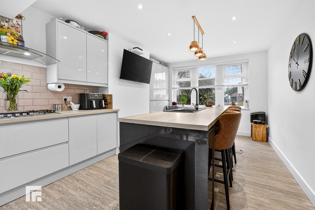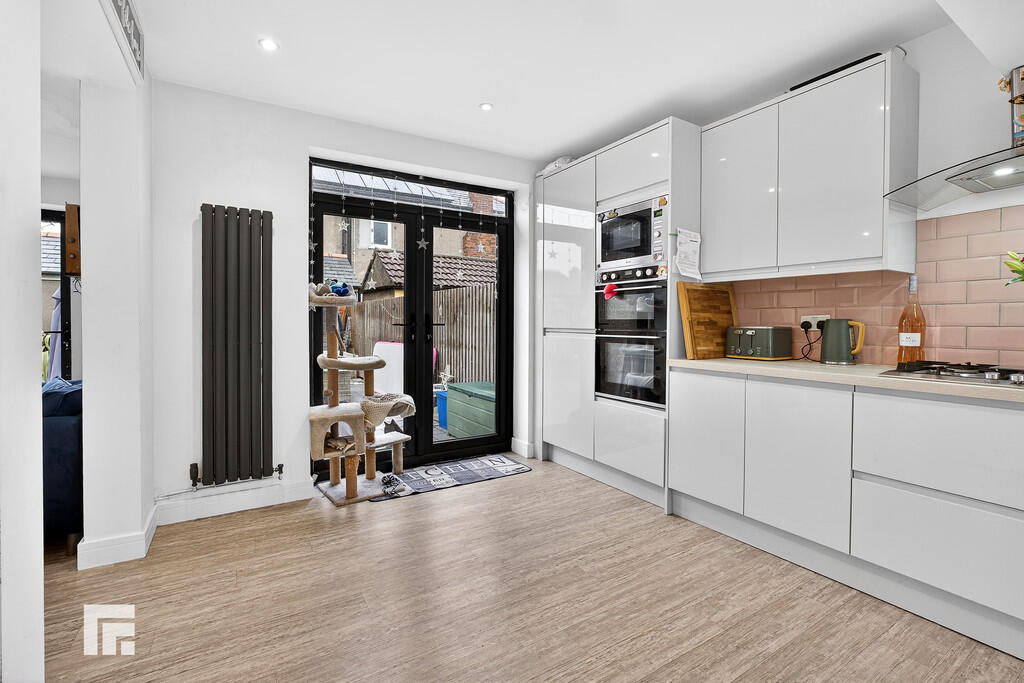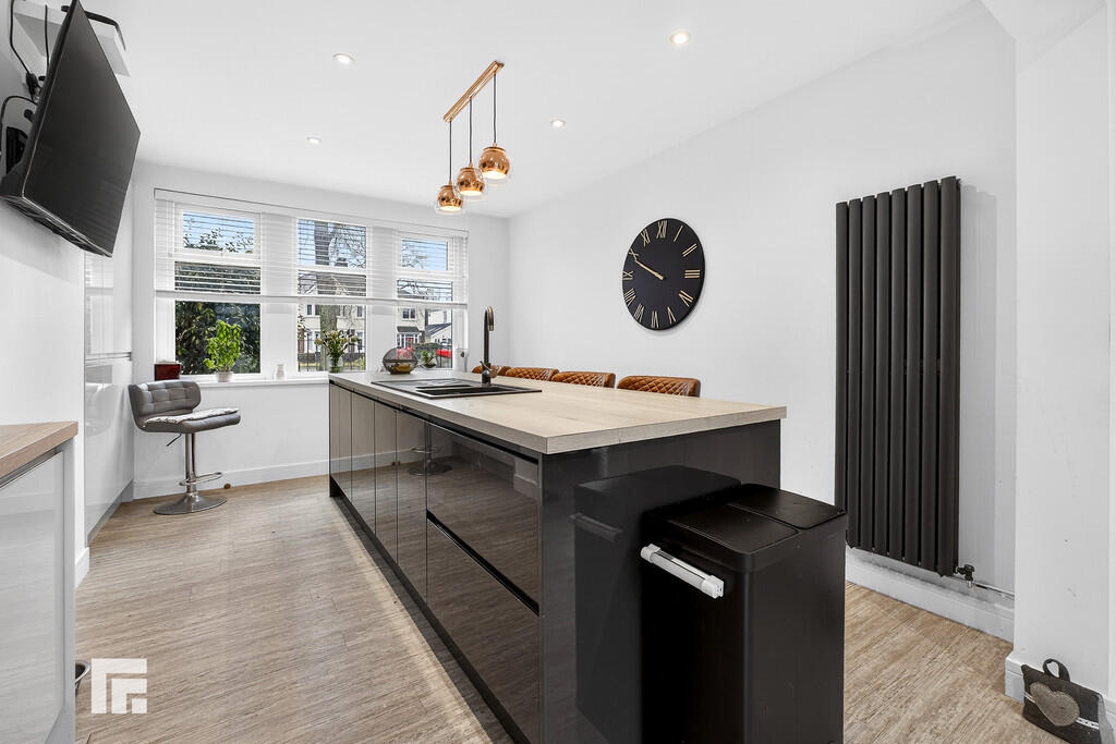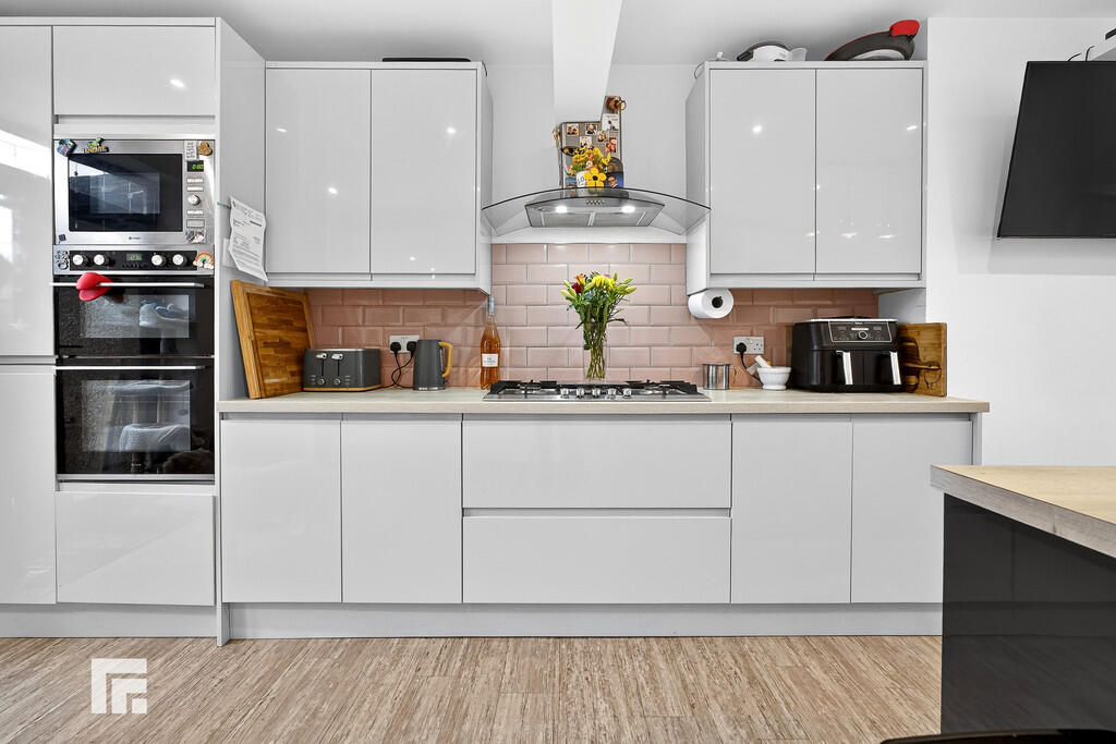 KITCHEN/DINER24' 4" x 11' 1" (7.43m x 3.40m) Laminate flooring. Spotlights and pendant light fitting. Modern fitted kitchen with a range of wall, base and drawer units with worktops over incorporating four ring gas hob with extractor above, and inset 1.5 sink and drainer with mixer tap over. Integrated appliances such as fridge/freezer, dishwasher, oven/grill, and microwave. Power points. Central island with ample stool seating beneath. TV point. Double glazed uPVC window to front aspect with additional double glazed uPVC French doors leading to rear garden. Two radiators. Opening into :-