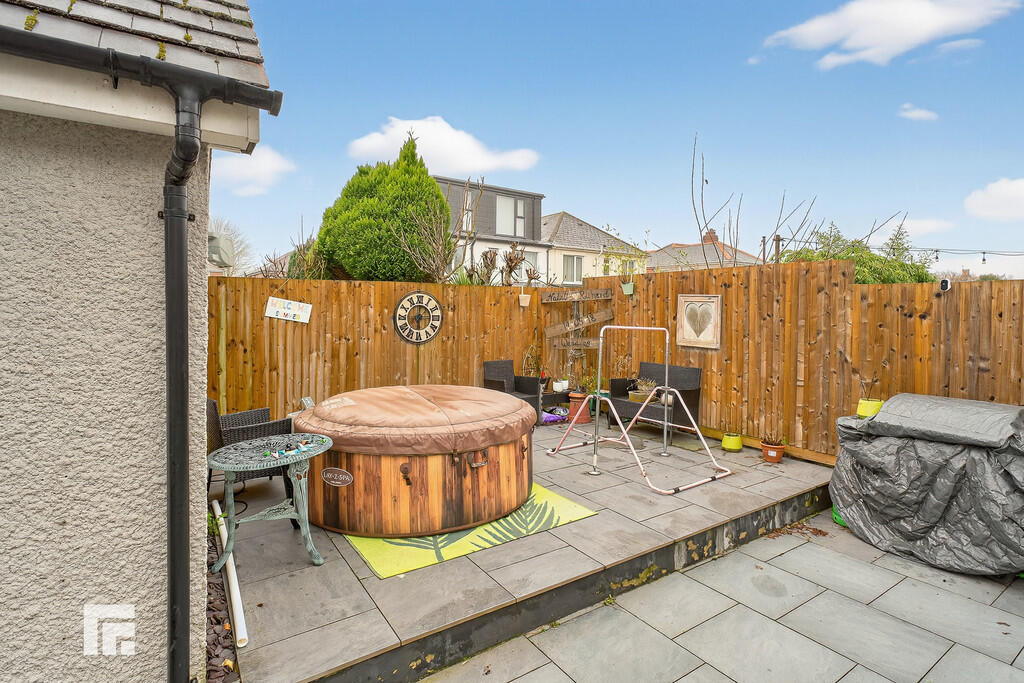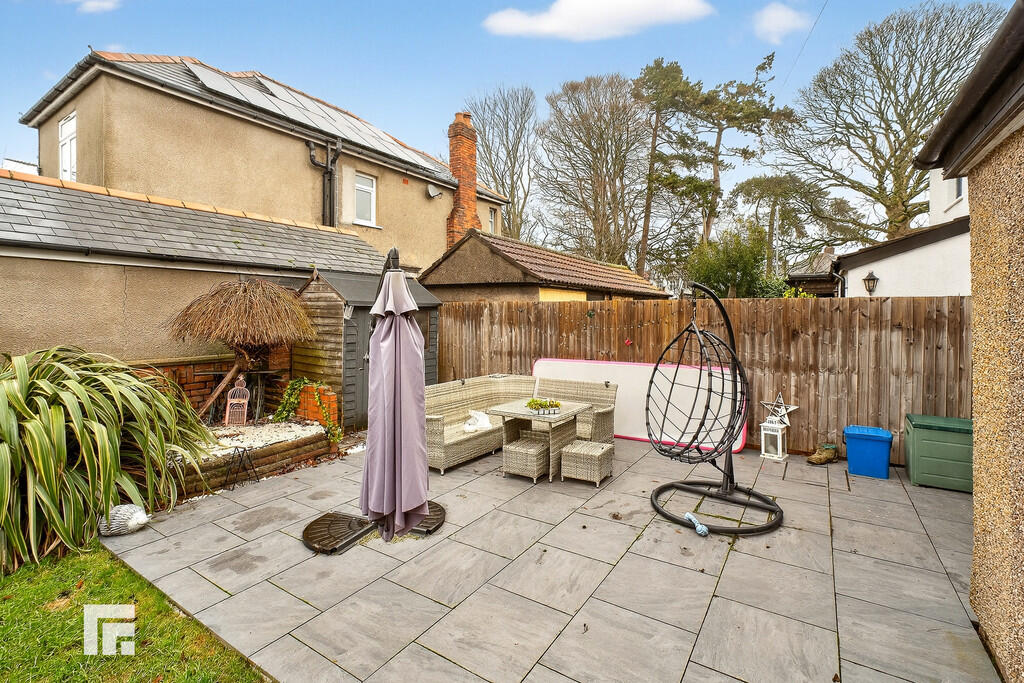 Rear - Laid to patio. Lawn area. Outside tap. Outside electrics. Access to outhouse. Fence and wall border. Shed.