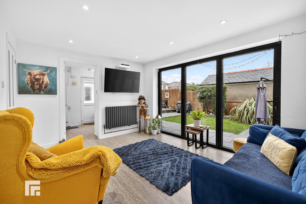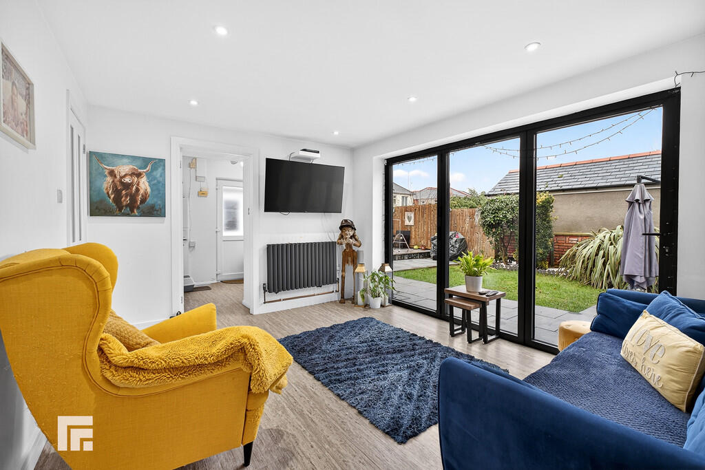 SITTINGROOM10' 9" x 12' 10" (3.29m x 3.92m) Continuation of laminate flooring. Spotlights. Radiator. Power points. TV point. Double glazed uPVC bi-folding doors leading to garden. Opening into :-