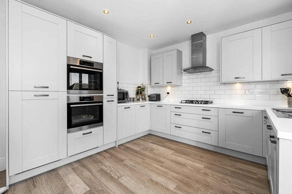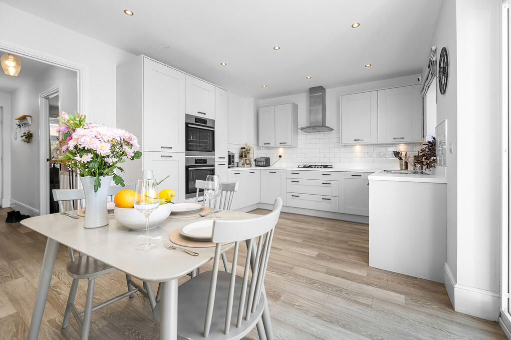 KITCHEN/DINER18' 0" x 11' 4" (5.50m x 3.46m) With modern kitchen well appointed along three sides in light panelled fronts beneath laminate worktop surfaces. Inset 1.5 bow stainless steel sink with side drainer. Inset four ring gas hob with curved glass cooker hood above. Two integrated 'AEG' ovens. Integrated fridge/freezer. Integrated dishwasher. Matching range of eye level wall cupboards. Tiled splashback. Ample space for large family dining table. Double opening french doors to the delightful south west facing rear garden. Panelled wall to one side. Utility cupboard with plumbing for washing machine. Amtico flooring. Radiator. Recessed spotlights.