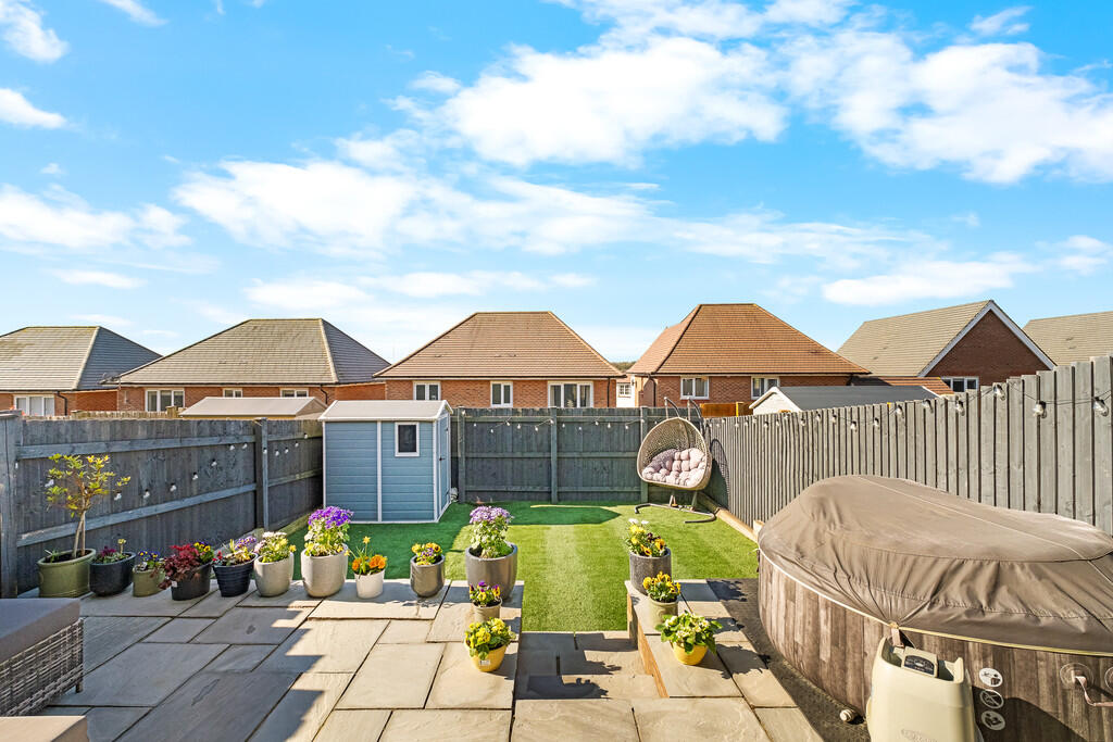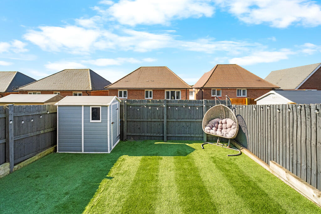 REARGARDEN A beautifully presented south west facing rear garden comprising large paved patio leading onto an area of artificial lawn. Enclosed by timber fencing. Side access with gate. Outside tap. Outside power point.