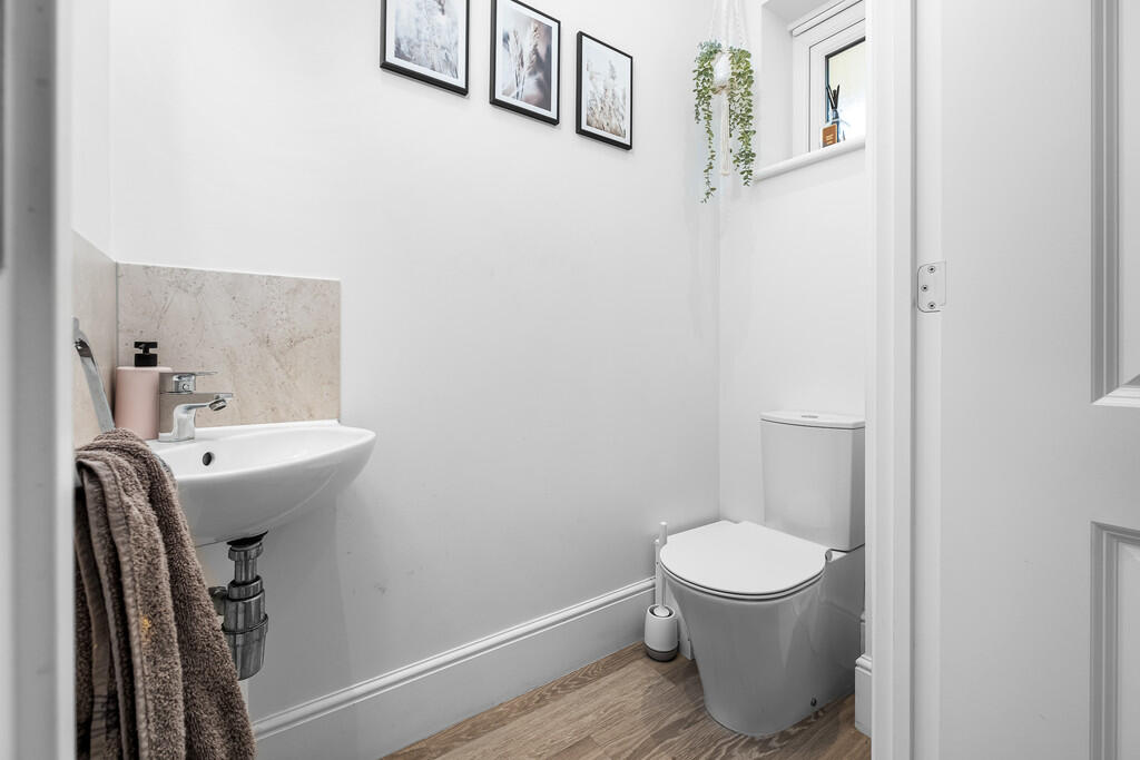 CLOAKROOM Quality white suite comprising low level wc, wash hand basin. Amtico flooring. Tiled splashback. Obscured glass window to front. Radiator.