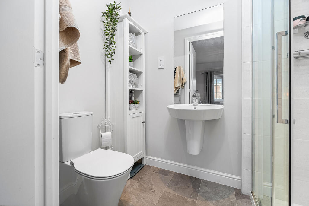 ENSUITESHOWERROOM Quality ensuite shower with white suite comprising low level wc, wash hand basin, double width shower cubicle with sliding glass door and chrome shower. Tiled splashback. Electric shaver point. Amtico flooring. Extractor fan. Chrome heated towel rail.