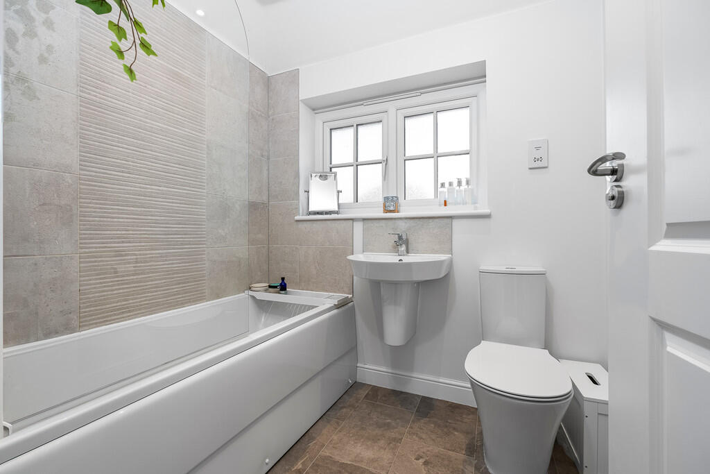 FAMILYBATHROOM6' 7" x 5' 6" (2.01m x 1.69m) Quality family bathroom with white suite comprising low level wc, wash hand basin, panelled bath with chrome shower above and swivel glass shower screen. Wall tiling to splash back areas. Obscured glass window to front. Electric shaver point. Recessed spotlights. Extractor fan. Chrome heated towel rail.