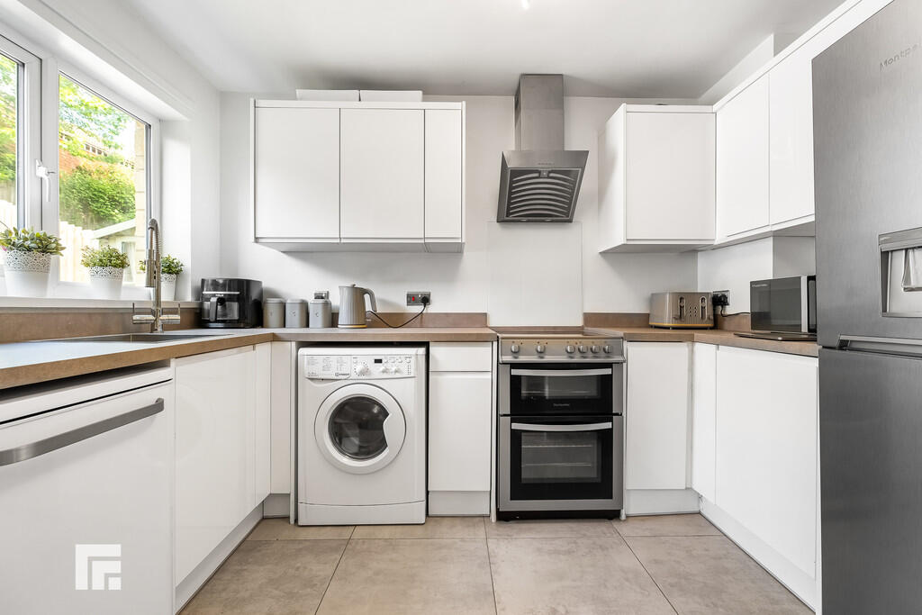 KITCHEN10' 6" x 6' 2" (3.22m x 1.89m) Modern fitted kitchen appointed along three sides in light high gloss fronts beneath concrete effect laminate worktop surfaces. Inset stainless steel sink. Space for slot in cooker with cooker hood above. Space for fridge freezer. Plumbing for washing machine. Plumbing for tumble dryer. Matching range of eye level wall cupboards. Window overlooking the rear garden. Tiled flooring.