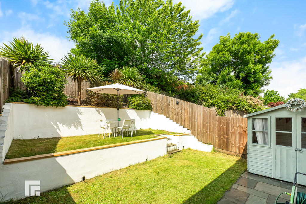 REARGARDEN Bordered by a timber fence, tiered garden with areas of lawn, mature trees and paved patio. Timber shed. Timber gate to side for access. Outside tap.