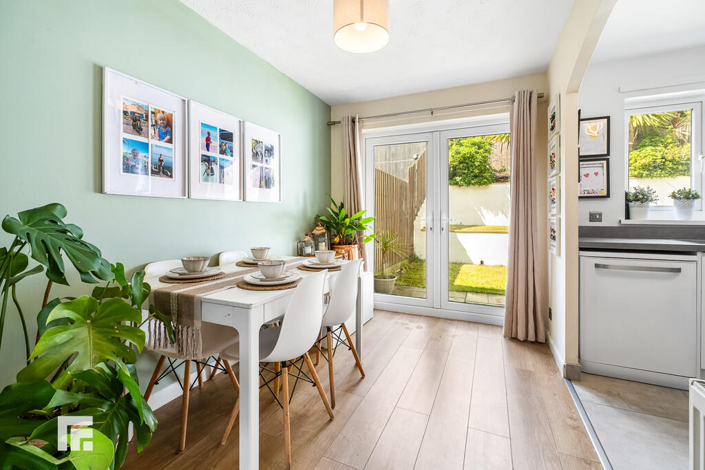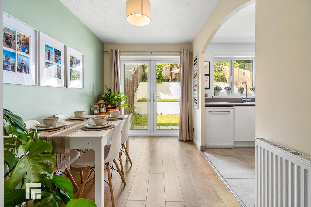 DININGROOM10' 6" x 7' 1" (3.21m x 2.17m) With french doors to the rear garden. With ample space for large family dining table. Laminate flooring. Archway to kitchen. Radiator.