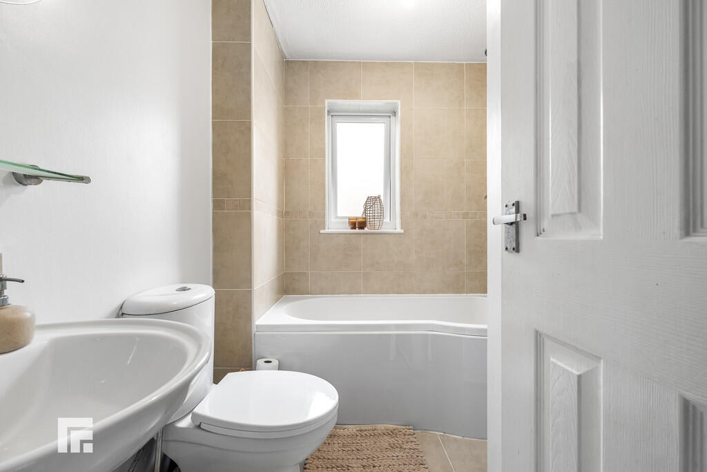 FAMILYBATHROOM7' 4" x 6' 2" (2.24m x 1.89m) Modern white suite; low level WC, pedestal wash hand basin with chrome mixer tap, curbed bath with chrome shower and glass shower screen and chrome heated towel rail. Tiled floor and splashbacks. Obscured glass window to side.