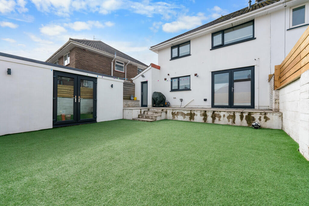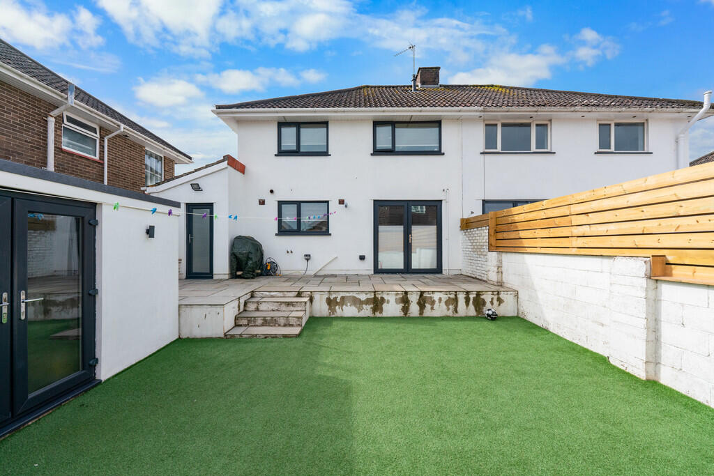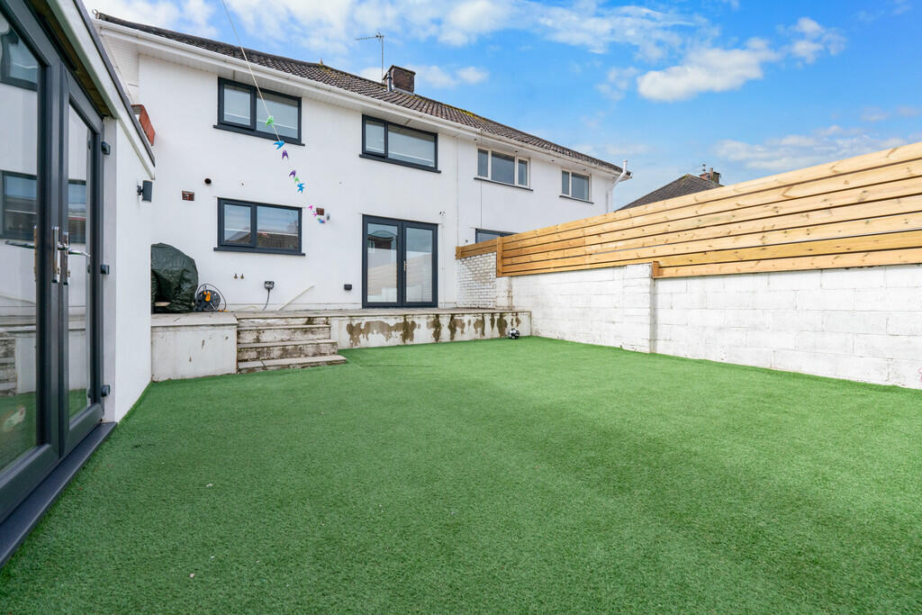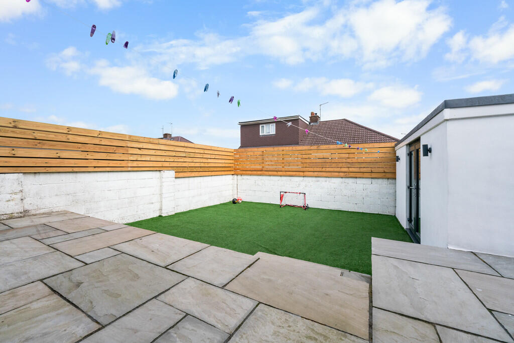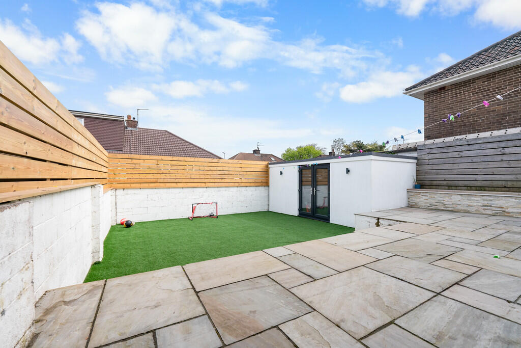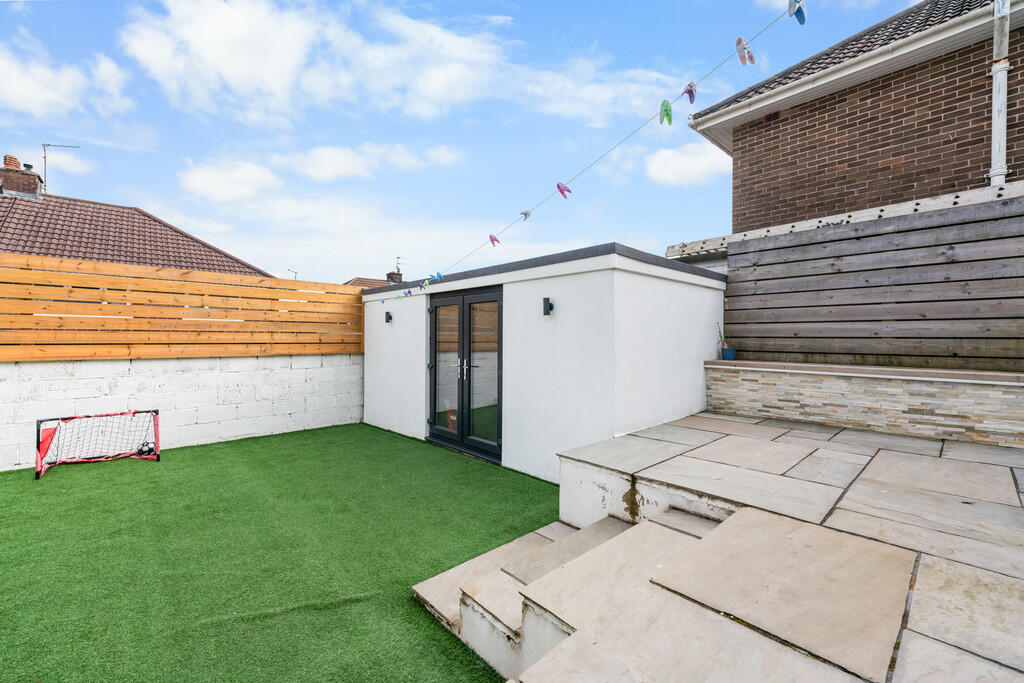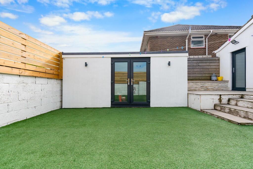 REARGARDEN A beautiful, low maintenance, good sized rear garden. Stone patio area and astro turf. Wooden fence, boundaries. Wooden seating area with tiled front. Two outside taps, one cold water and separate hot water tap. External power sockets.