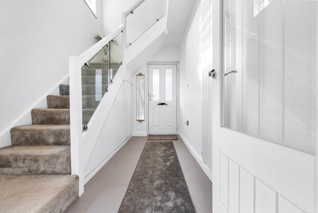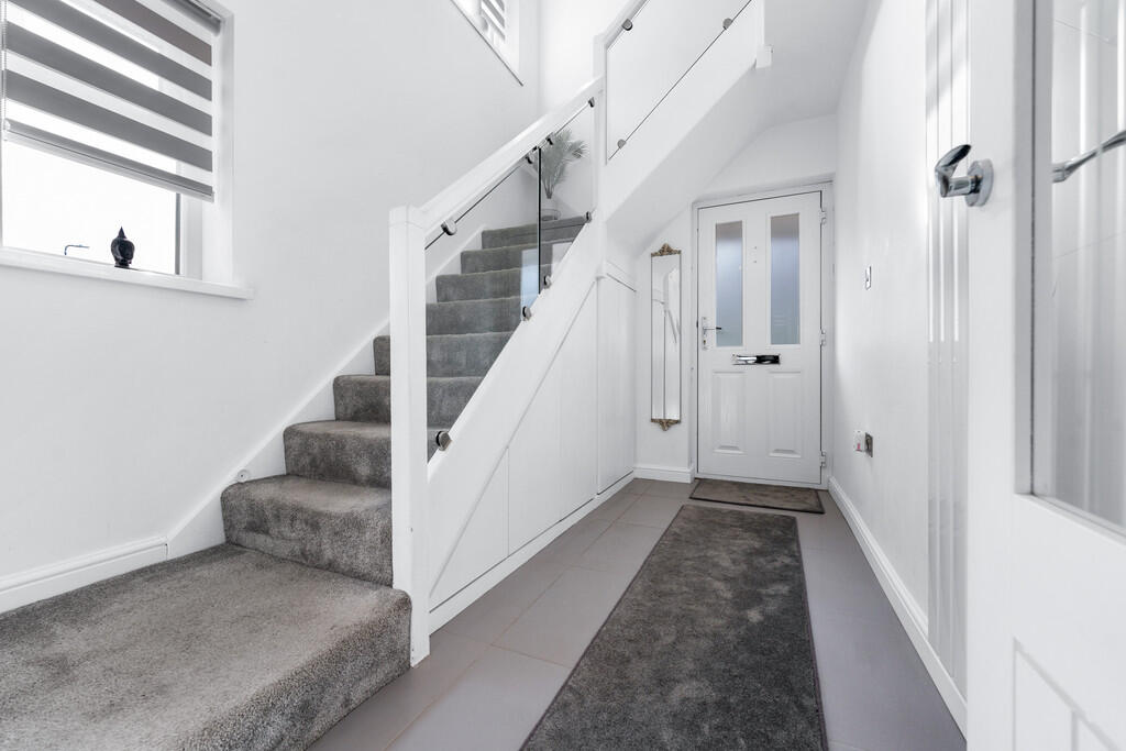 ENTRANCEHALLWAY10' 10" x 6' 9" (3.32m x 2.07m) Entered via a composite door, a spacious light hallway with high ceiling. Built in under stairs storage, tiled flooring, vertical modern radiator, uPVC window to side. Door leading to kitchen. Stairs leading to landing area.