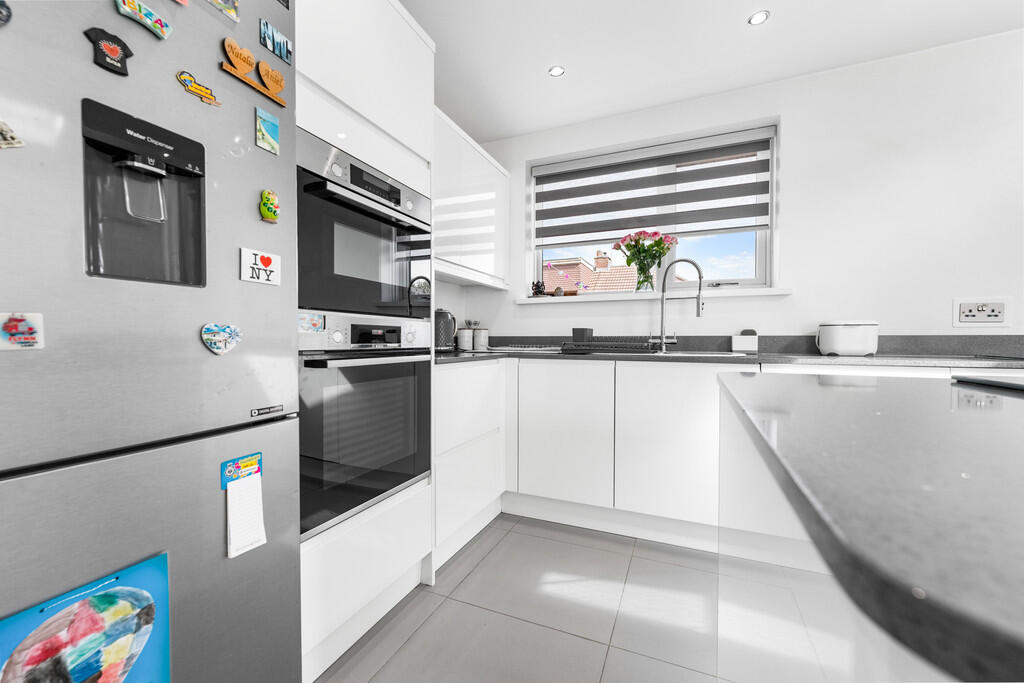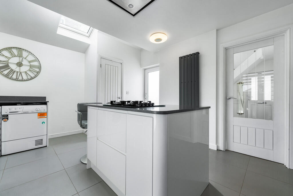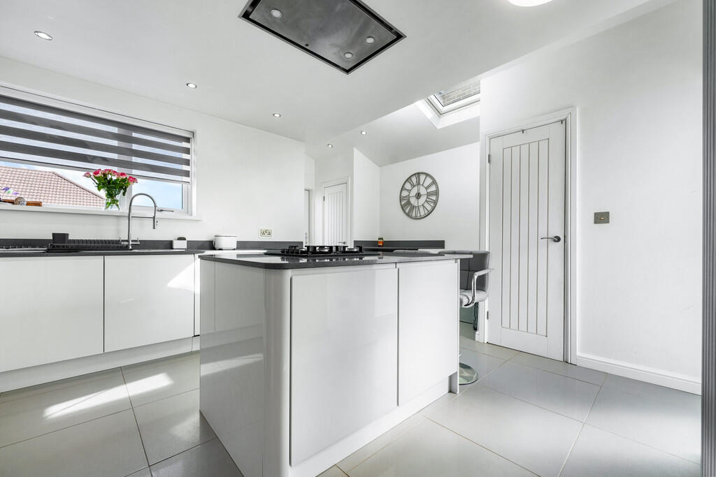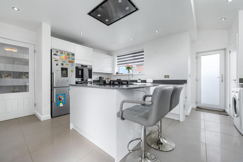 KITCHEN15' 8" (max)x 15' 1" (max)(4.78m x 4.61m) White high gloss units along three sides, grey quartz worktops and splashbacks. Stainless steel bowl sink with drainer and chrome hose tap, Bosch integrated microwave/grill, integrated oven, integrated dishwasher, large island with four ring gas hob, recessed extractor fan, space for fridge freezer, washing machine and dryer. Tall storage cupboard, vertical radiator and tiled flooring. uPVC door to front. uPVC door to back. Door leading to cloakroom.