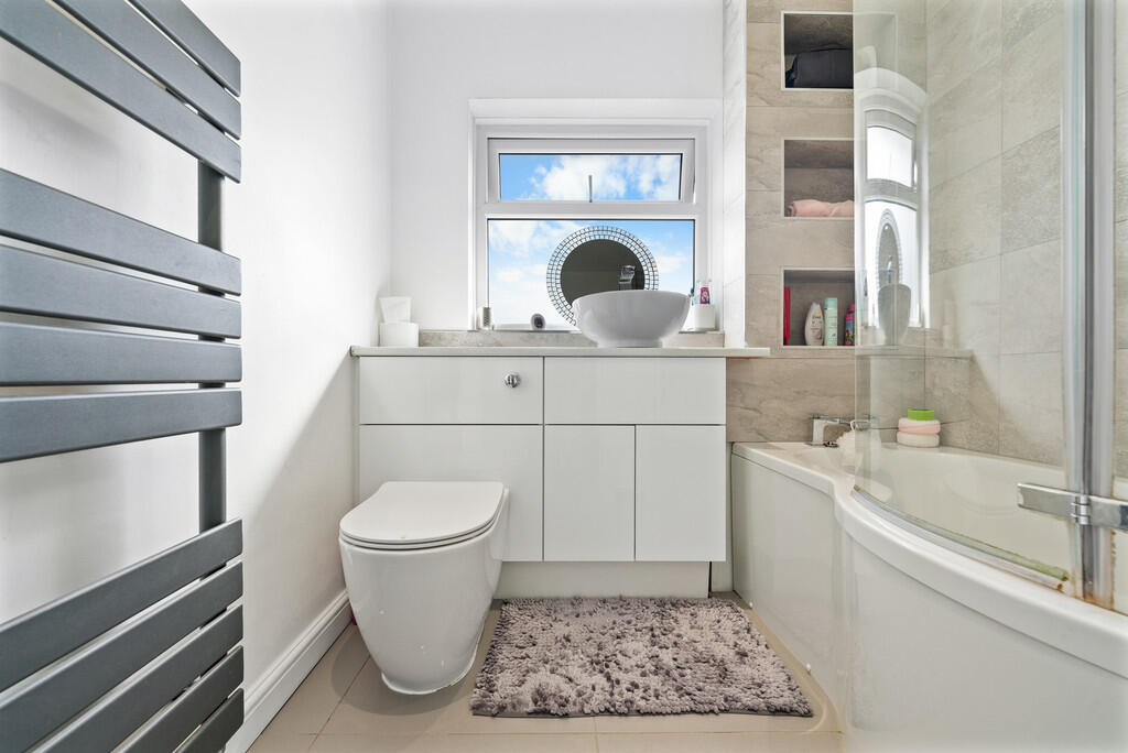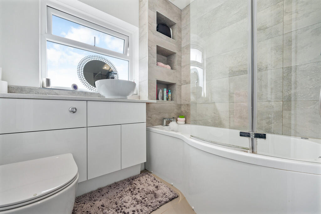 FAMILYBATHROOM6' 5" x 5' 7" (1.98m x 1.71m) Obscured glass sliding door; Modern white suite with low level WC, wash hand basin with chrome tap, built in vanity/storage, curved bath with chrome mixer tap, dual headed chrome gas shower, curved glass screen, tiled splashbacks, tiled flooring. Modern heated towel rail, extractor fan, uPVC obscured glass window to side.