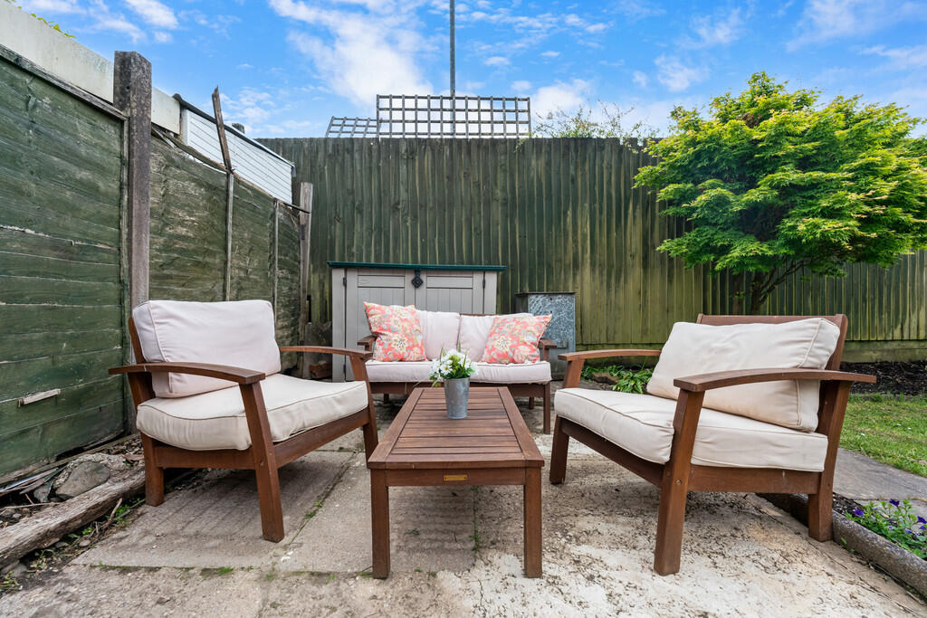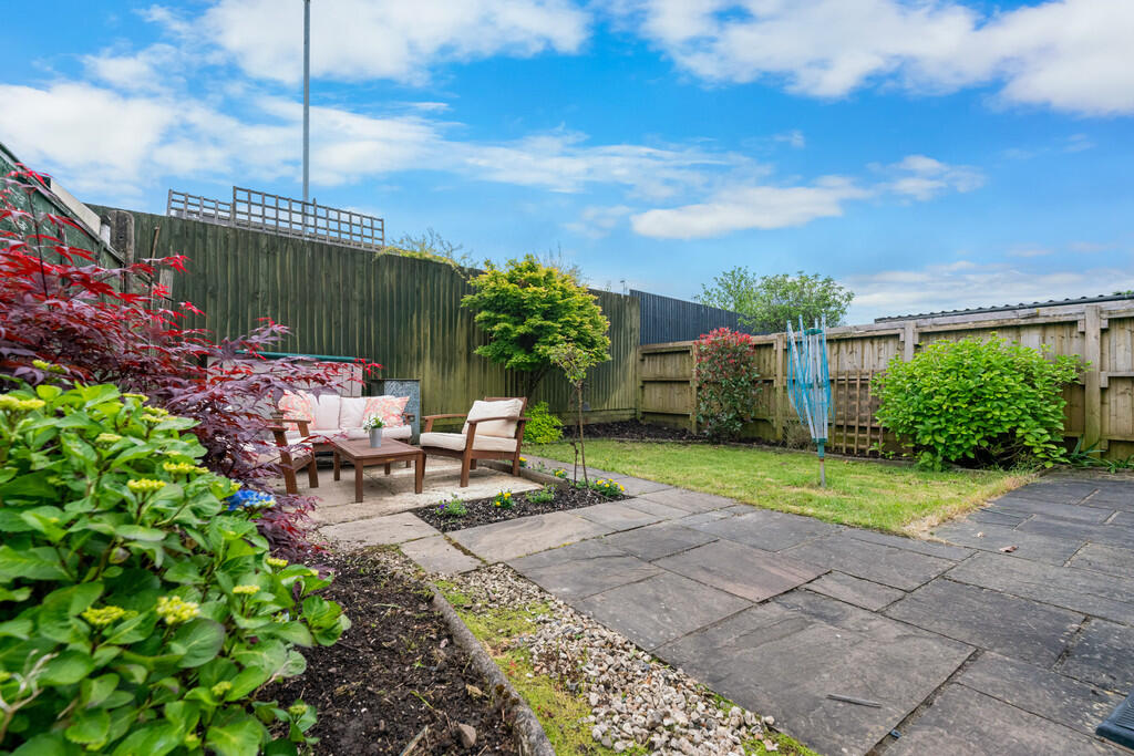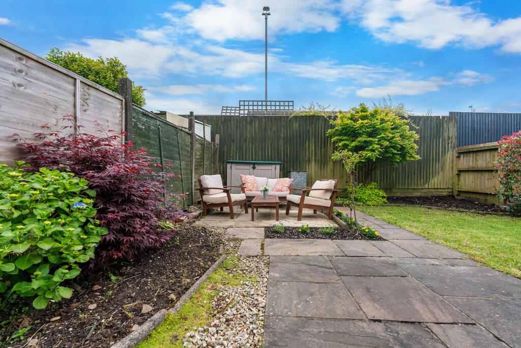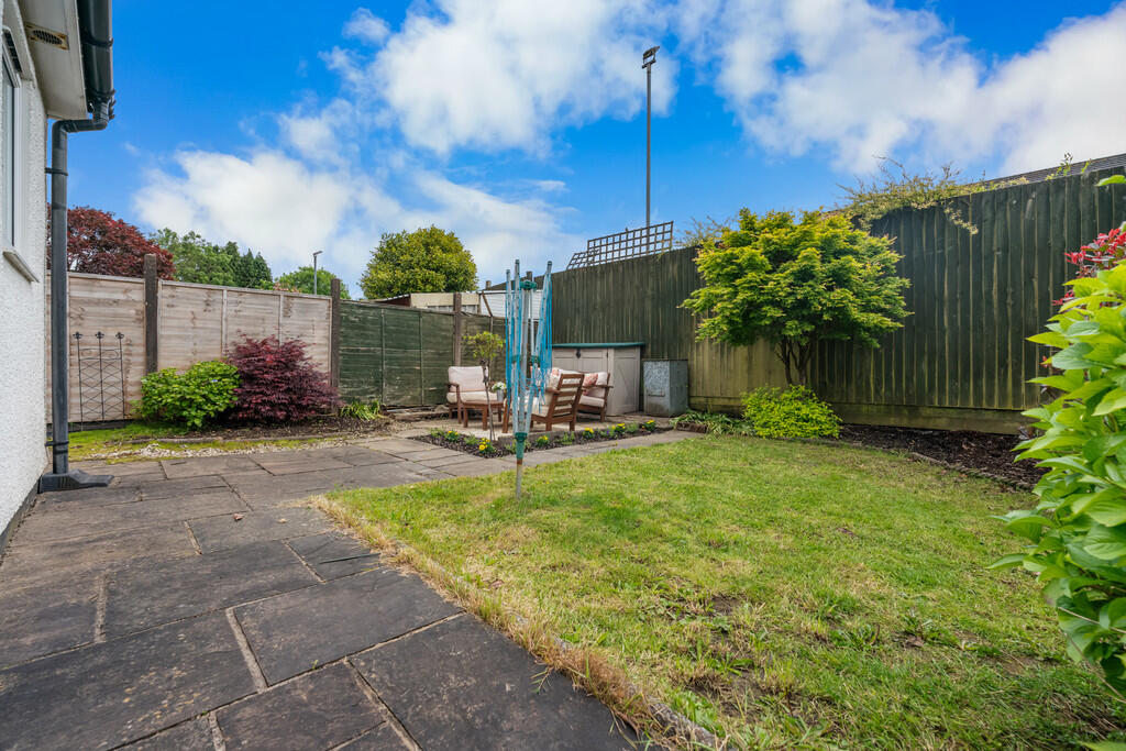 REARGARDEN With large paved patio and a shaped area of lawn with inset beds of plants, trees and shrubs. Covered lean to to side with paved patio below. Timber gate to side.
