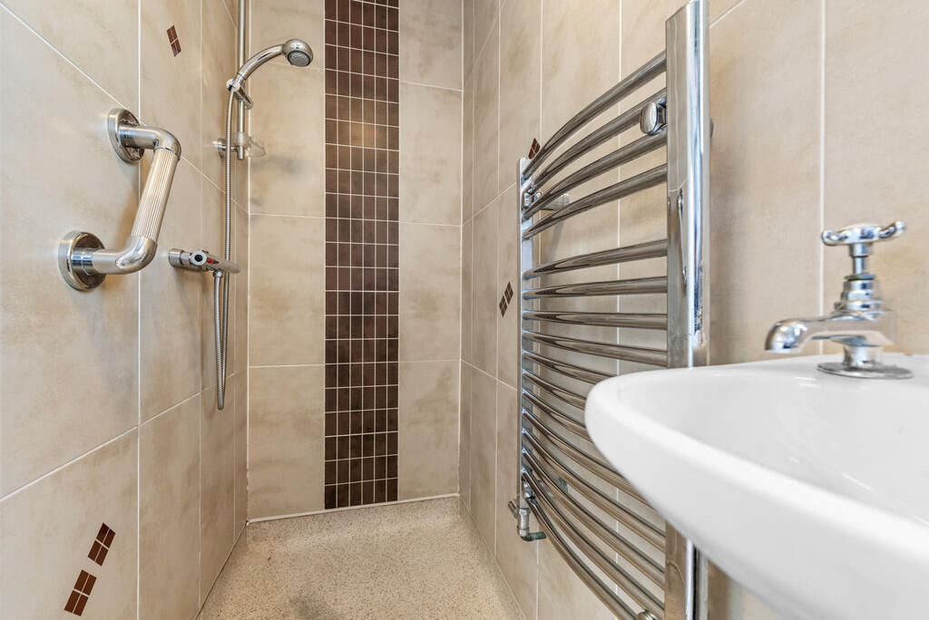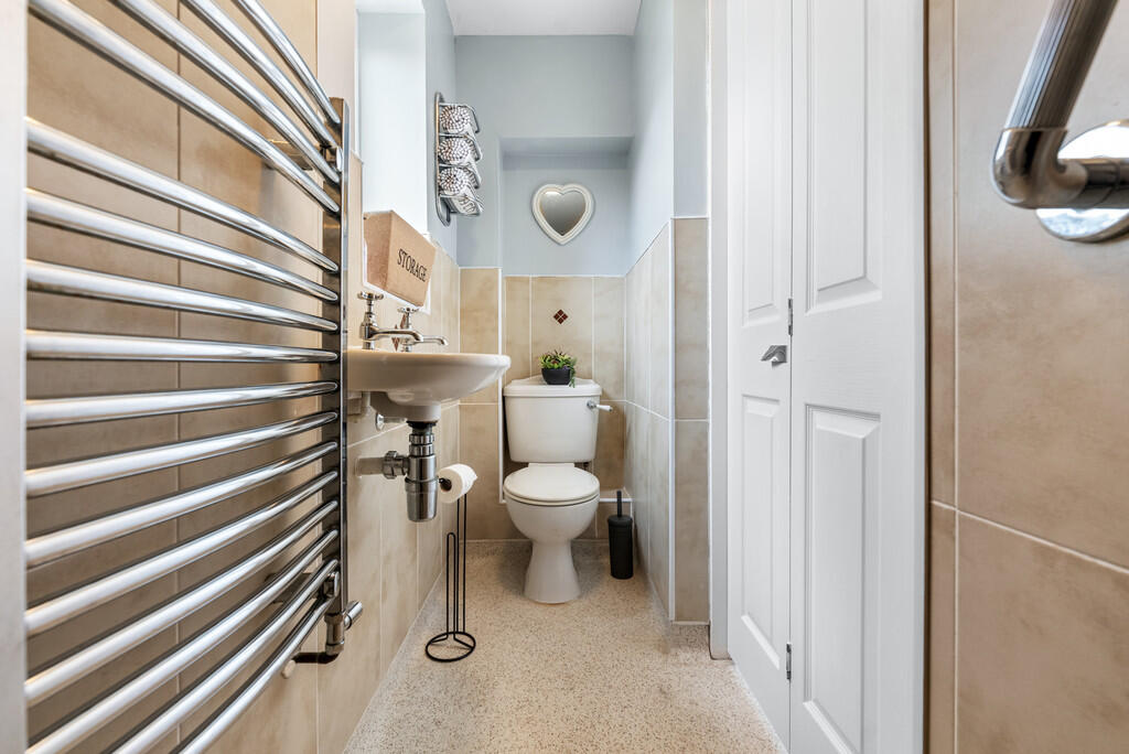 WETROOM Modern fitted wet room comprising low level wc, wash hand basin, chrome shower. Obscured glass window to side. Full wall tiling. Anti slip wet room flooring. Chrome heated towel rail.