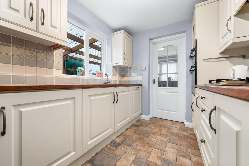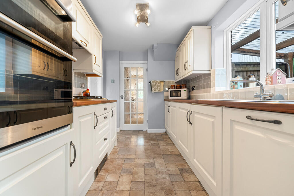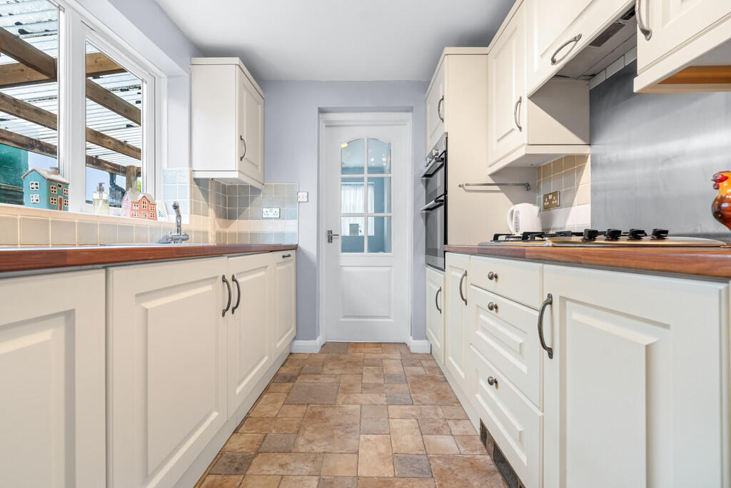 KITCHEN10' 4" x 7' 5" (3.17m x 2.27m) With units to two sides with worktops above. Inset 1.5 bowl sink with side drainer. Inset four ring gas hob with concealed cooker hood above. Integrated oven and grill. Integrated dishwasher. Matching range of eye level wall cupboards. Tiled splash back. Window to side. Door to utility room.