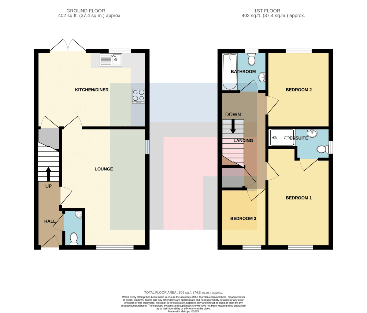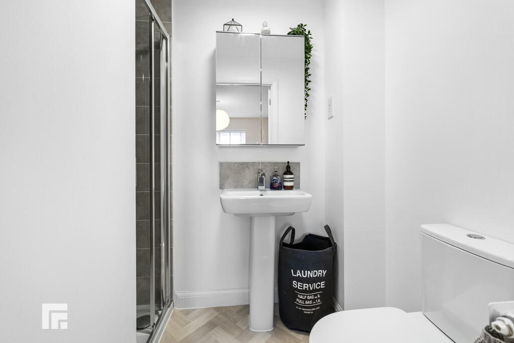 ENSUITE8' 5" (max)x 4' 5" (2.58m x 1.36m) Modern white suite; low level WC, pedestal wash hand basin with chrome mixer tap, shower cubicle either glass folding screen, and chrome shower. Tiled splash backs. Quality vinyl flooring. Shaving point. Mirrored wall cabinet. Extractor fan. Radiator.