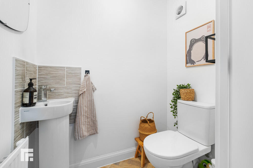 CLOAKROOM5' 2" x 3' 1" (1.59m x 0.94m) Modern white suite; low level WC, corner pedestal wash hand basin with chrome mixer tap. Tiled splash-back. Extractor fan. Radiator. Continuation of flooring from hallway.