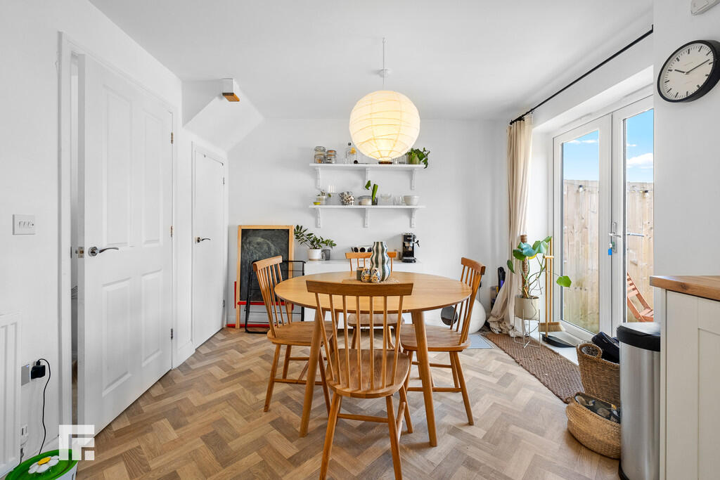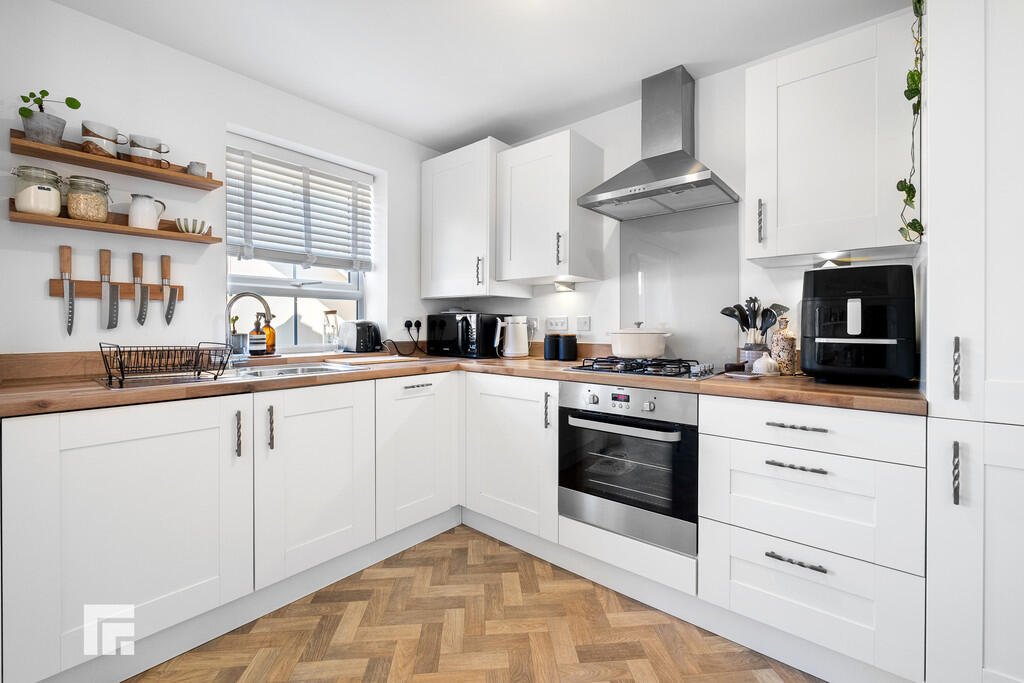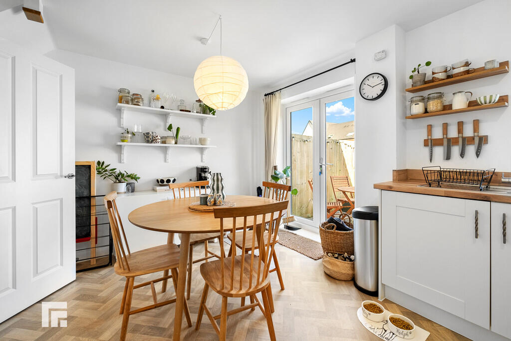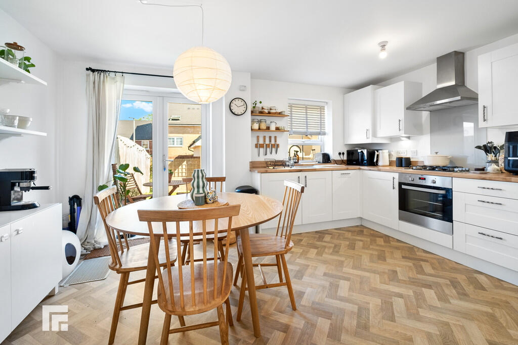 KITCHEN/DININGROOM14' 11" x 10' 5" (4.55m x 3.18m) Appointed along two sides, modern, neutral shaker style kitchen with eye and low level cupboards beneath quality wood effect laminate worktops. Stainless steel sink with chrome mixer tap and drainer, integrated four ring gas hob, integrated oven, integrated fridge freezer, integrated washing machine and integrated slimline dishwasher. Ample space for dining room table. Cupboard housing 'Ideal' combi boiler. Quality wood effect vinyl flooring. Large under-stairs storage cupboard. uPVC window to rear. Double French doors opening out into the well maintained rear garden.