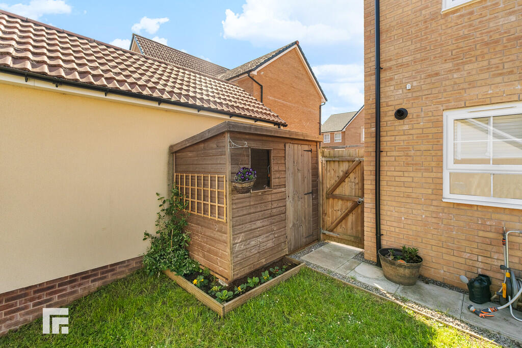 REARGARDEN Bordered by a timber fence, paved patio seating area and large area laid to lawn. A further decked seating area. Timber shed. Outside tap. Gate to side for access.