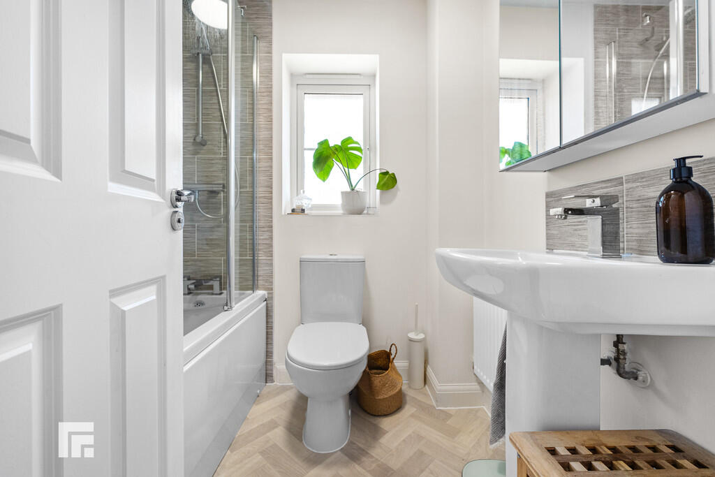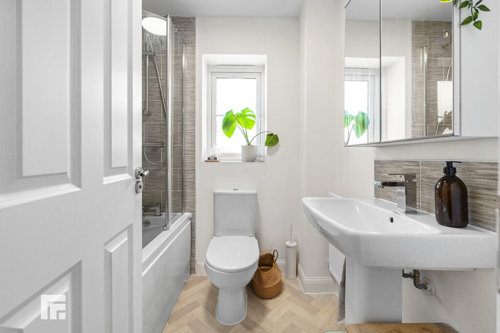 FAMILYBATHROOM5' 6" x 6' 2" (1.69m x 1.89m) Modern white suite; low level WC, pedestal wash hand basin with chrome mixer tap, bath with chrome mixer tap, glass shower screen and chrome shower. Tiled splash backs. Mirrored wall cabinet. Radiator. Extractor fan. Obscured glass window to rear.