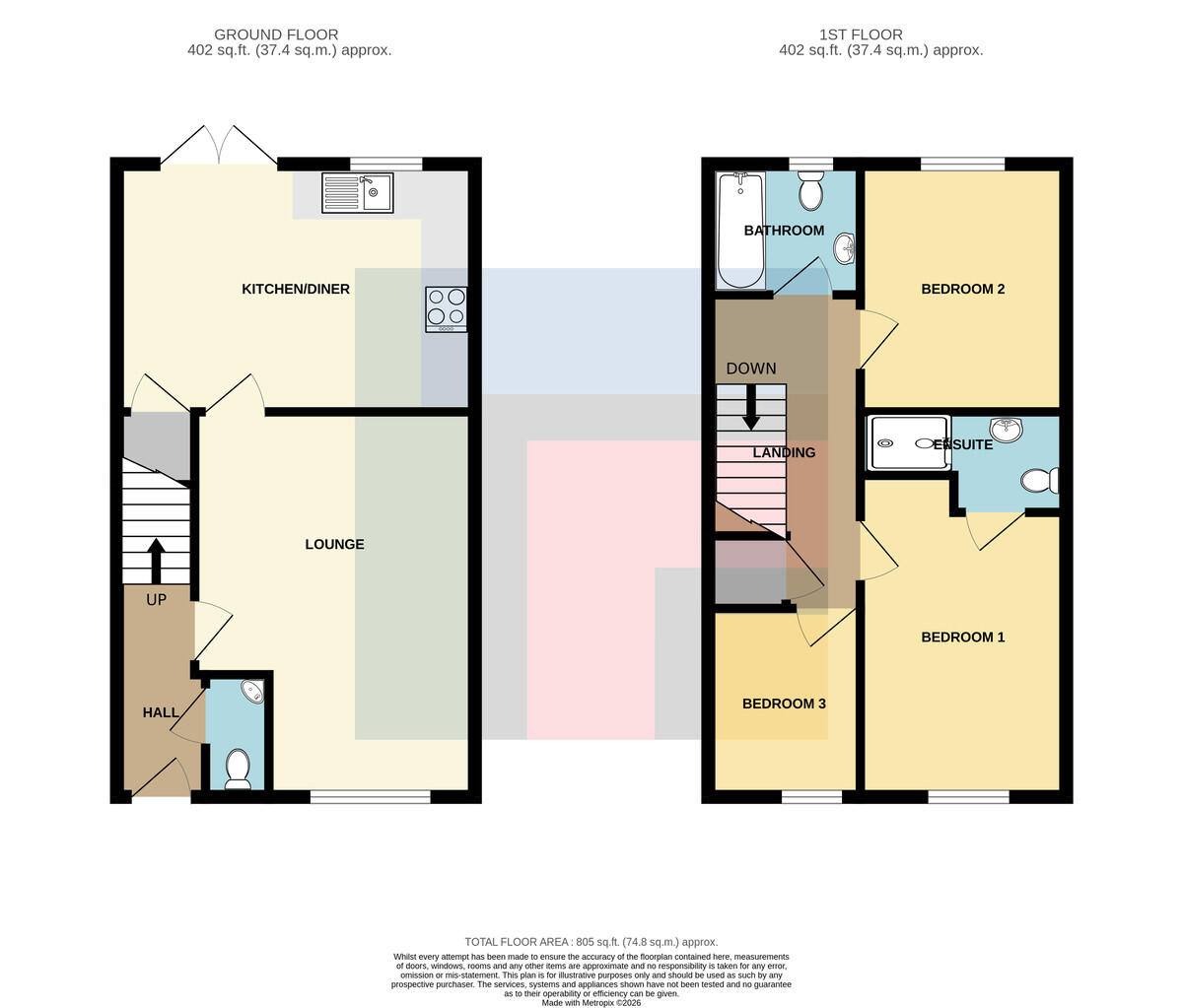ENSUITE8' 5" x 4' 4" (2.57m x 1.34m) Modern white suite; low level WC, pedestal wash hand basin with chrome mixer tap, built in shower cubicle with chrome shower and glass folding door. Tiled splash back and to half height. Chrome heated towel rail. Extractor fan.