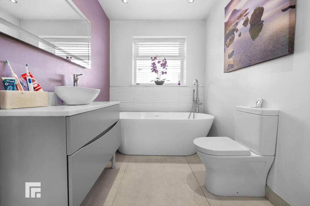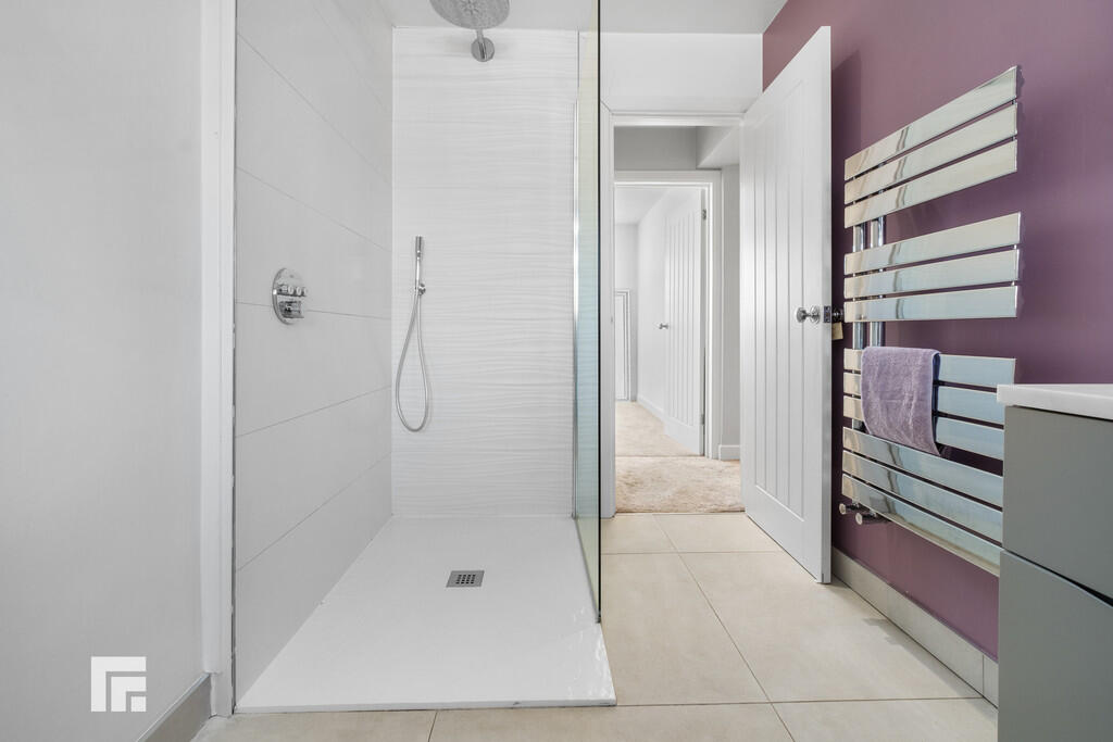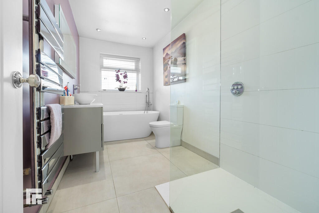 FAMILYBATHANDSHOWERROOM12' 2" x 6' 1" (3.71m x 1.87m) Quality, modern fitted white suite comprising low level wc, vanity wash basin with storage below, walk in shower cubicle with chrome twin head shower and freestanding bath with side tap/shower mixer. Quality tiled flooring. Wall tiling to splash back areas. Recessed spotlights. Obscured glass window to rear. Chrome heated towel rail.