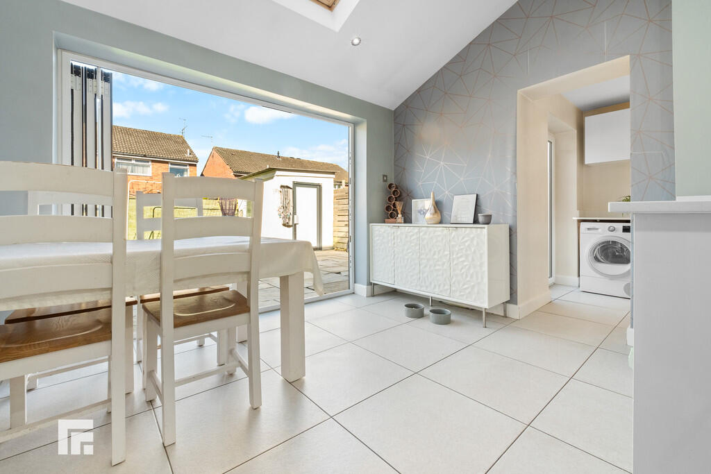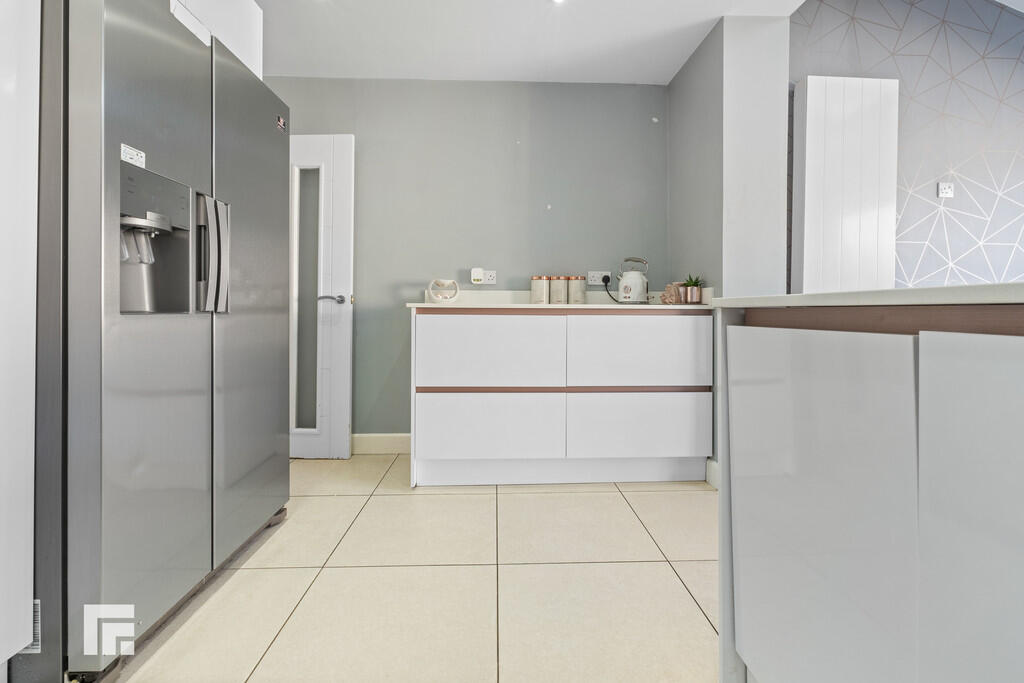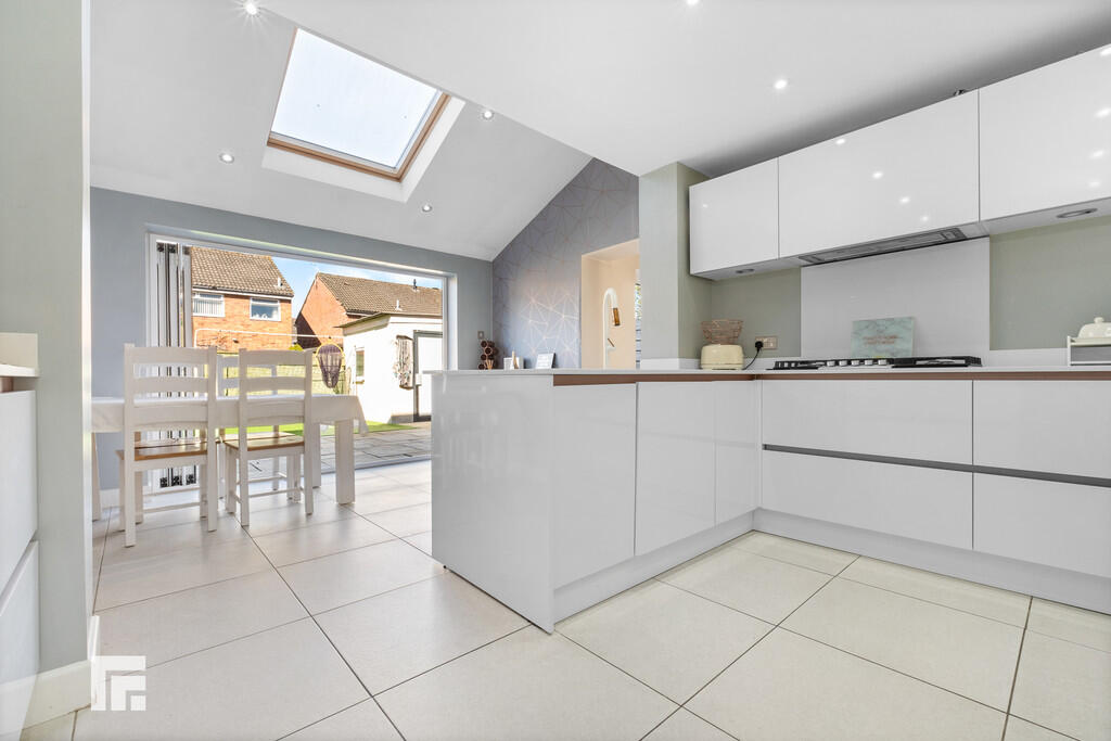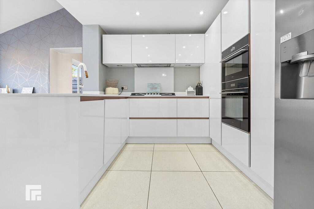 KITCHENANDDININGROOM18' 1" x 12' 11" (5.52m x 3.96m) Well appointed along four sides in white gloss handle less doors beneath quartz worktop surfaces. Inset 1.5 bowl sink with worktop side drainer. Inset five ring gas hob with concealed cooker hood above. Integrated oven and microwave. Space for American style fridge freezer. Integrated slim line dishwasher. Matching range of eye level wall cupboards. Ample space for large family dining table. Recessed spotlights. Velux window to rear pitch. Worktop breakfast bar area. Quality tiled flooring. Tri folding doors opening to the rear garden. Vertical radiator. Opening to utility room.