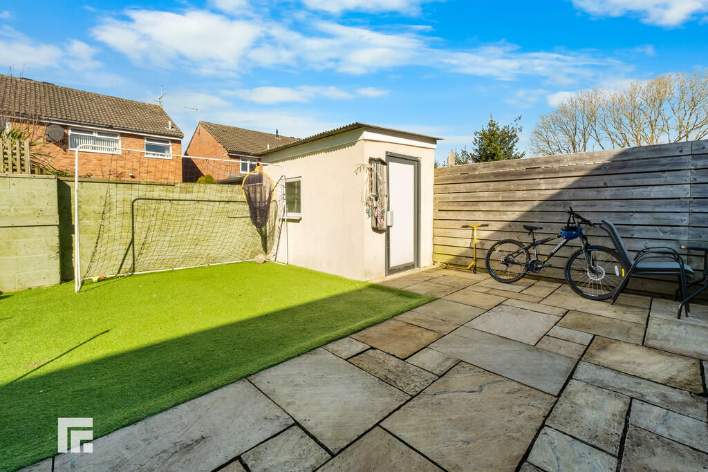 REARGARDEN Paved patio leading onto an area of artificial lawn. Fully enclosed. Brick built storage shed to the rear of the garden.