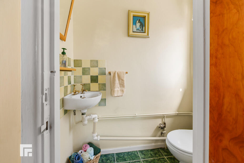 CLOAKROOM5' 8" x 3' 2" (1.73m x 0.97m) White suite; low level WC, wall hung corner wash hand basin with dual taps, chrome heated towel rail and tiled splash-back and flooring. Obscured glass window to side.
