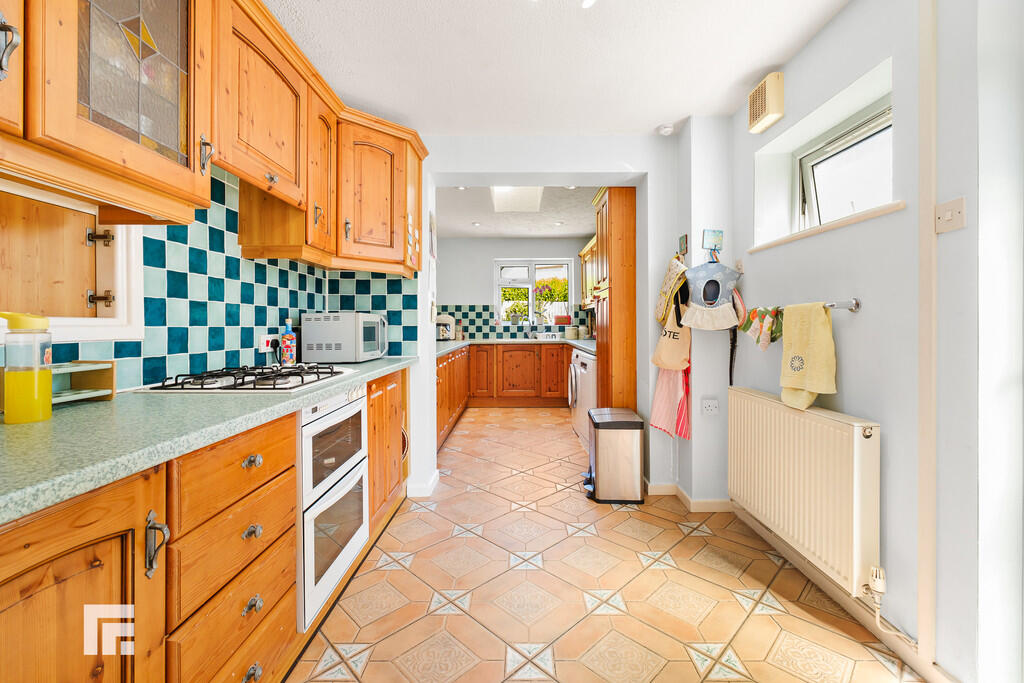 KITCHEN23' 0" x 8' 10" (7.02m x 2.70m) Appointed along three sides, eye and low level wood cupboards beneath laminate worktops, composite sink with chrome mixer tap and drainer, integrated four ring gas hob, integrated oven and grill, plumbing for washing machine and dishwasher, space for fridge freezer, tiled splash-backs and flooring, spotlights and extractor fan. Hatch into dining room. uPVC window to rear. Velux window. uPVC door to side.