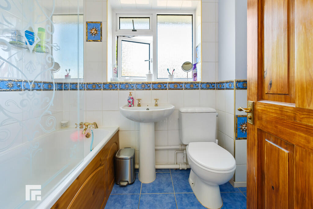 FAMILYBATHROOM6' 11" x 5' 4" (2.11m x 1.65m) White suite; low level WC, pedestal wash hand basin with dual taps, panelled bath with gold mixer tap, electric shower and glass shower screen. Radiator. Tiled splashbacks and flooring. Obscured glass window to rear.
